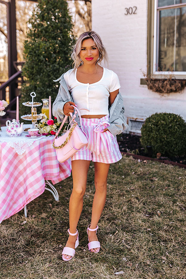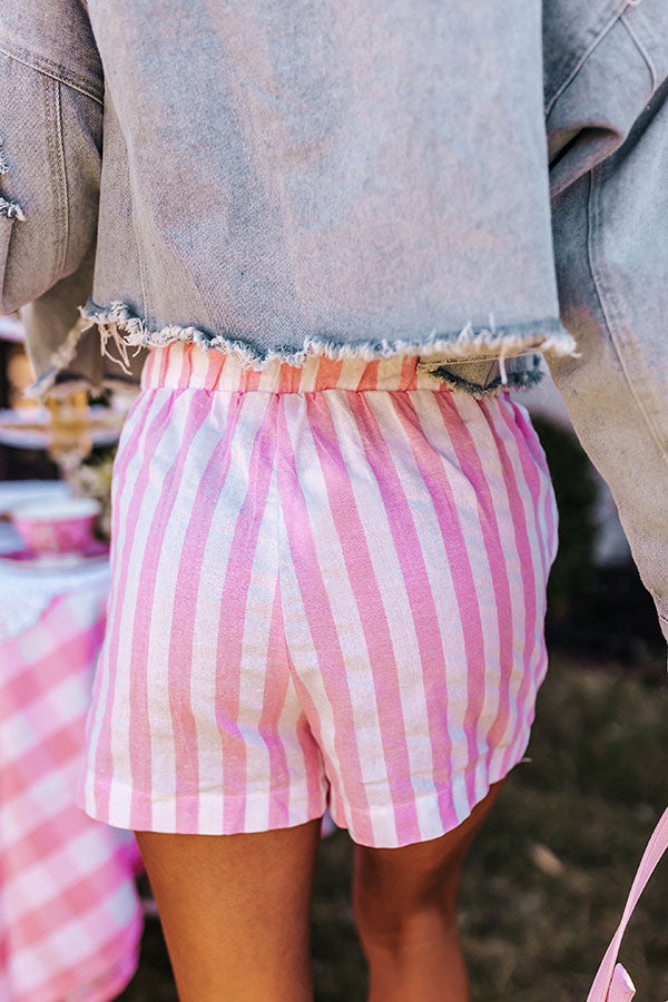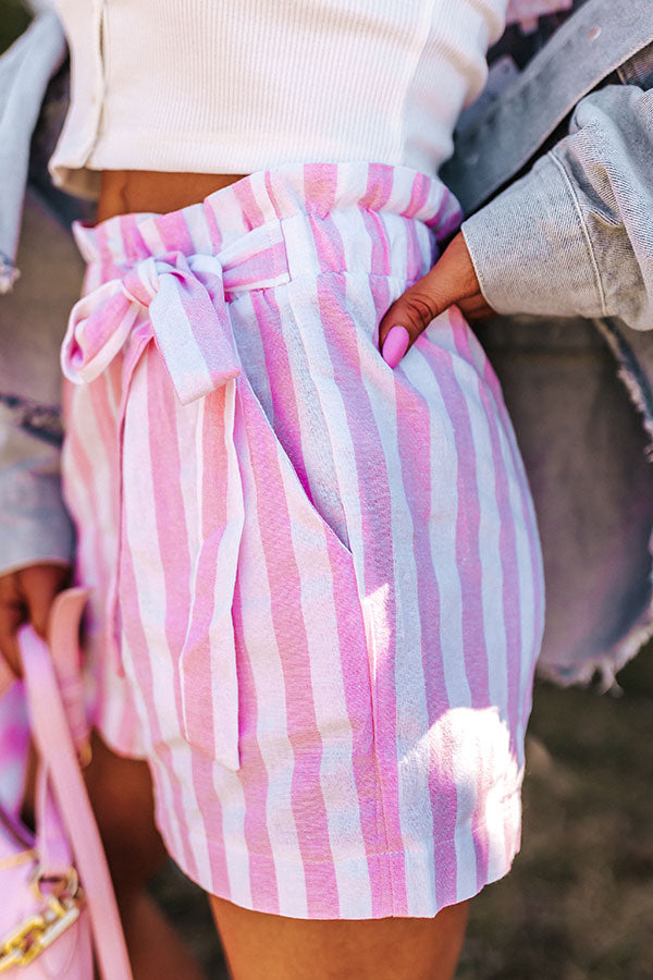 Our cute 'Half Moon Harbor' shorts are perfect for every spring occasion with their lightweight material, vertical pink and white accent stripes, ruffle trim waistline with a tie belt, accent side pockets, and relaxed silhouette that ends in straight upper-thigh length hemlines!