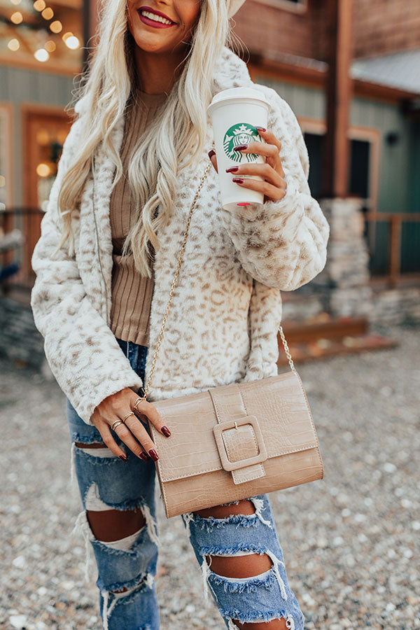 You won't find a better everyday bag than our stunning iced latte colored "Half Past Noon" crossbody featuring sleek faux leather material with alligator print texturing, a large square accent buckle, a removable gold chain shoulder strap, and a lightweight rectangular silhouette with a flap closure and additional inside pockets!