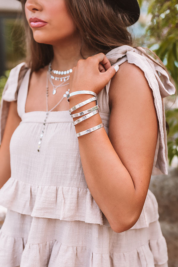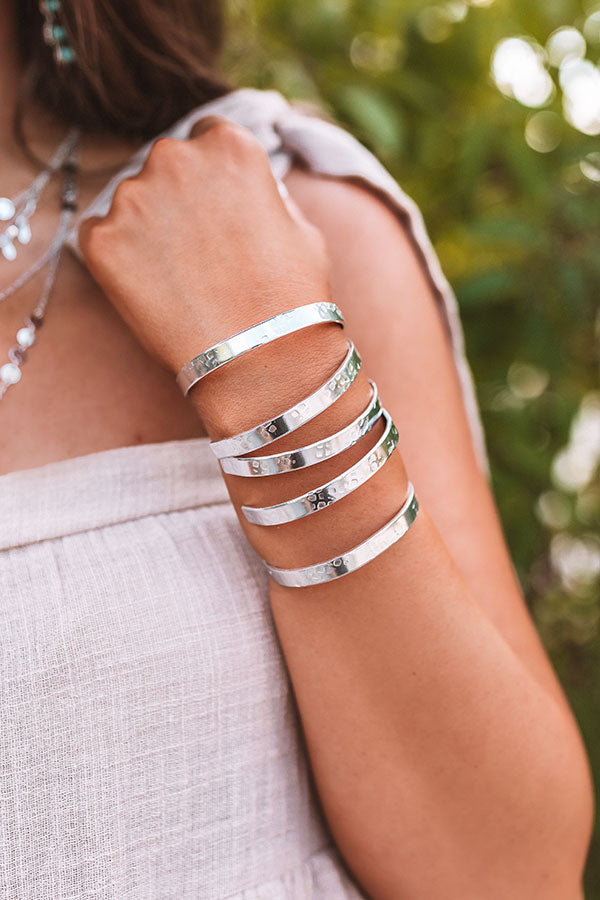 These five lightweight stackable cuffs are slightly adjustable and will be lightly distressed and textured! They are a brushed silver color and are made of pure high grade aluminum 1100, so they will not tarnish or change colors! PLUS, they are handmade in the USA!