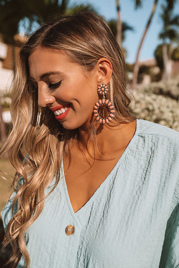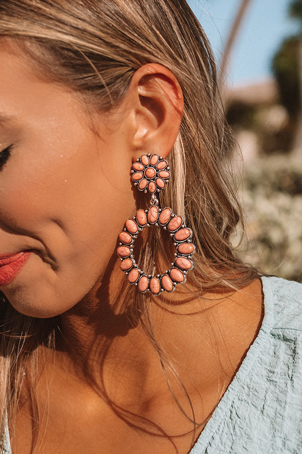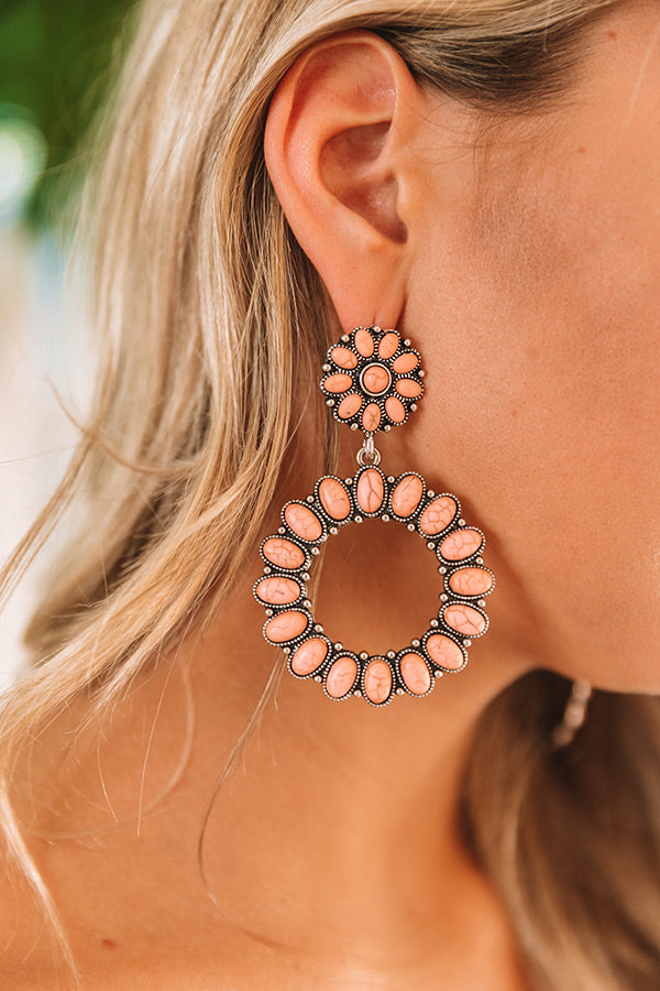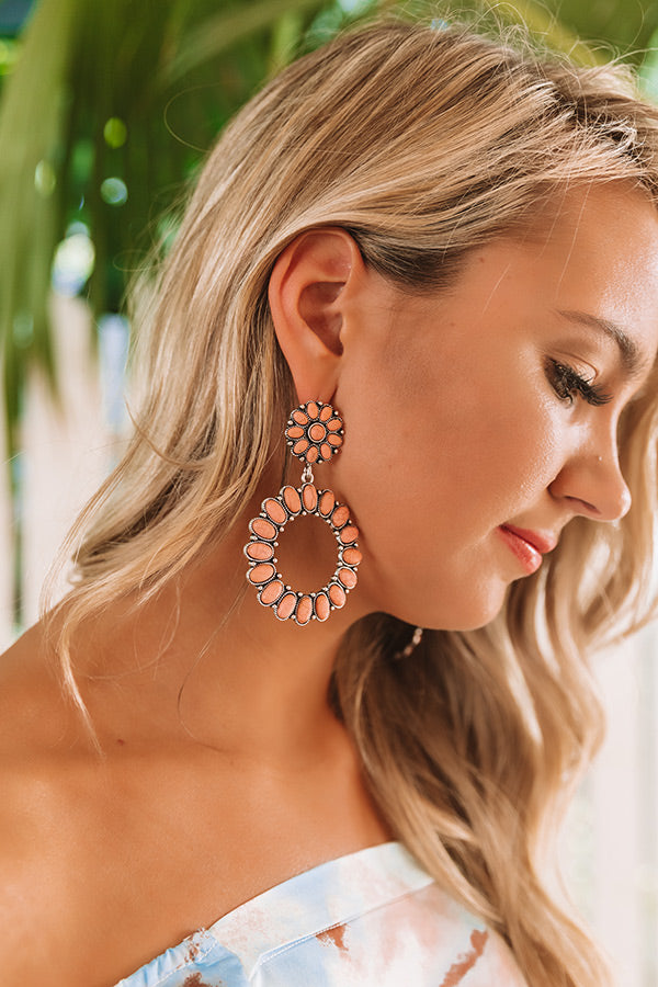 You will want to show off your OOTD when you accessorize with our adorable "Hamptons Hideout" statement earrings featuring peach colored faux stone flower shaped studs and large dangling hoops!