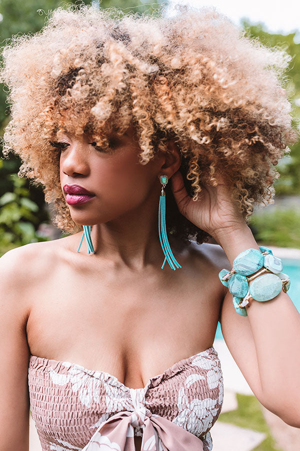 Get ready in style by accessorizing with our stunning "Hamptons Ready" statement earrings featuring turquoise shoulder-length tassels!