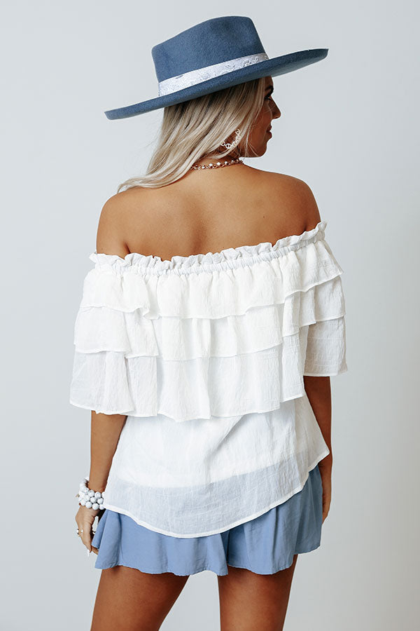 Spend your summer in style with this luxe white top featuring lightweight breezy material with tiered ruffles, an elastic off shoulder neckline with flowy drop sleeves, and a flattering silhouette that ends in a straight hemline!