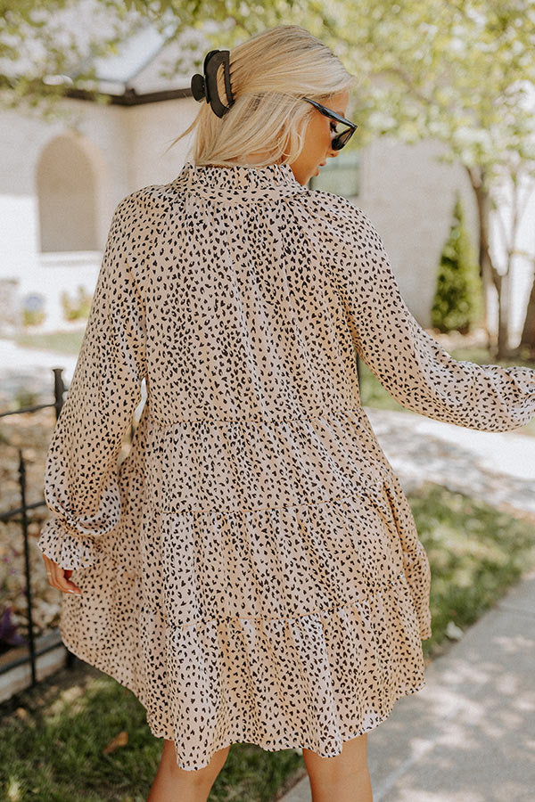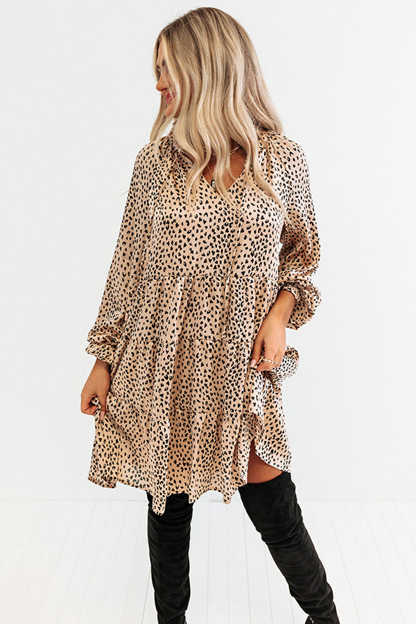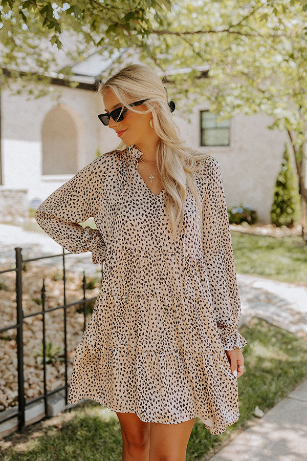 Believe us when we say you'll want to be spotted in our cute iced latte hued 'Hang Onto Love' shift dress featuring lightweight material patterned with a small black leopard print, a v-cut neckline with a tie closure, loose 3/4-length sleeves with ruffle trim detailing, and a relaxed tiered silhouette that falls into a straight mid-thigh length hemline!