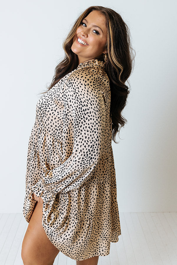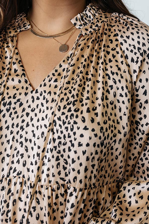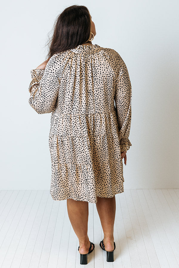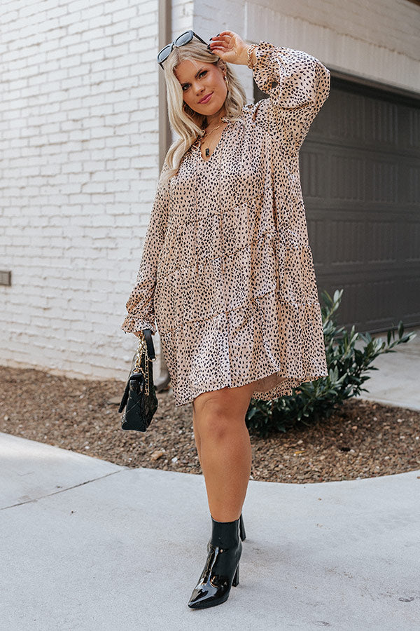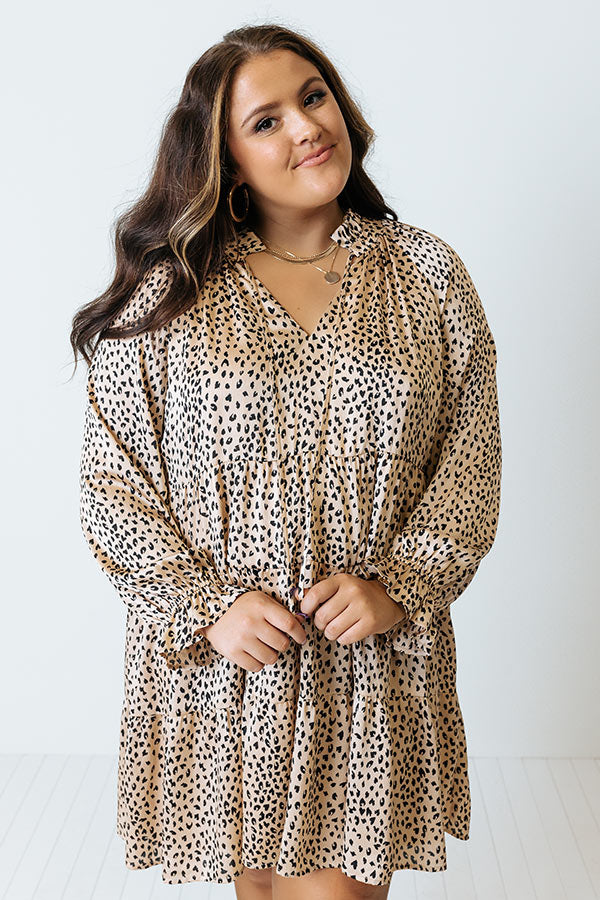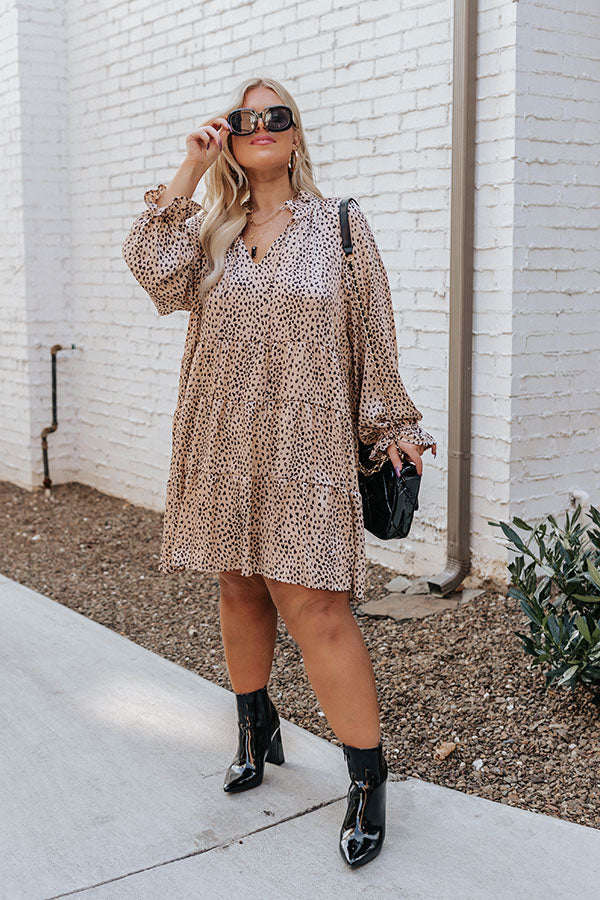 Believe us when we say you'll want to be spotted in our cute iced latte hued plus size 'Hang Onto Love' shift dress featuring lightweight material patterned with a small black leopard print, a v-cut neckline with a tie closure, loose 3/4-length sleeves with ruffle trim detailing, and a relaxed tiered silhouette that falls into a straight mid-thigh length hemline!