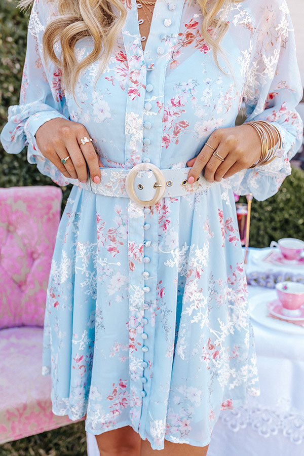 Spring into style with our beautiful sky blue 'Happier Now' dress featuring lightweight material patterned with a delicate white and coral hued floral print, a button down front with a rounded neckline, long loose sleeves with button closure cuffs, a matching belt, and a relaxed but flattering silhouette that falls into a straight mid-thigh length hemline!