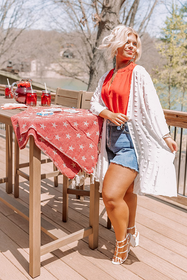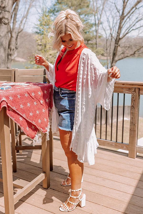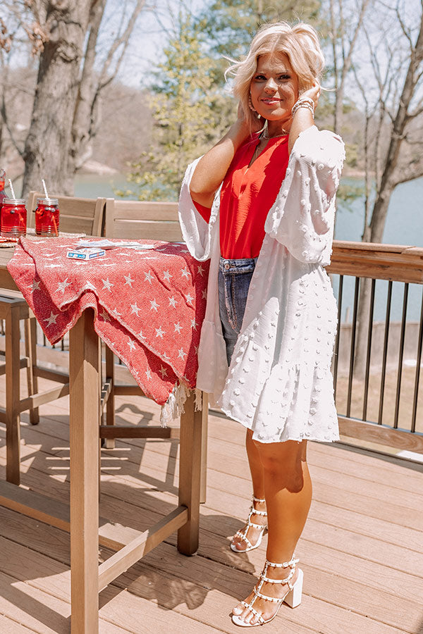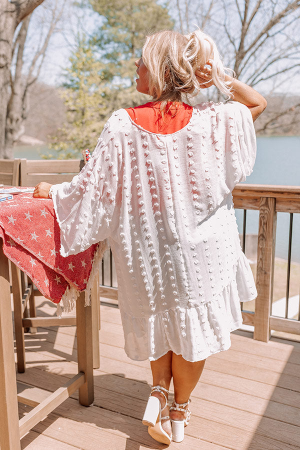 Layer up for spring in our darling white plus size 'Happier Now Overlay' featuring lightweight material with polka dot knit texturing, loose 3/4-length sleeves, and a draped open front silhouette that falls into a ruffled mid-thigh length hemline! on products