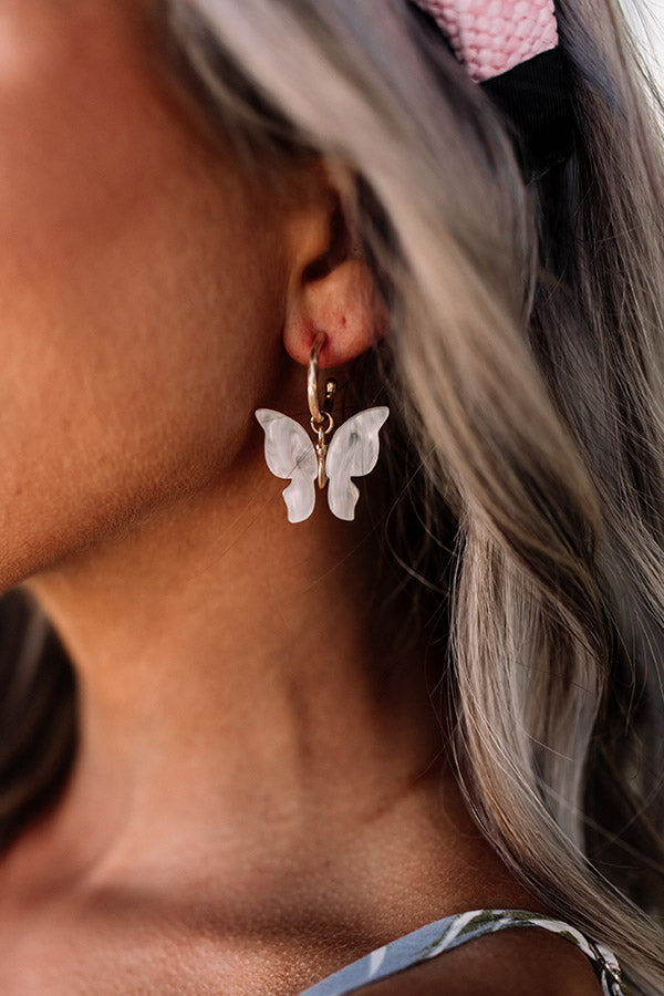 We have no doubt you will be the happies girl in the room when you accessorize with these darling earrings featuring gold hoops with dangling white butterflies!