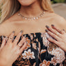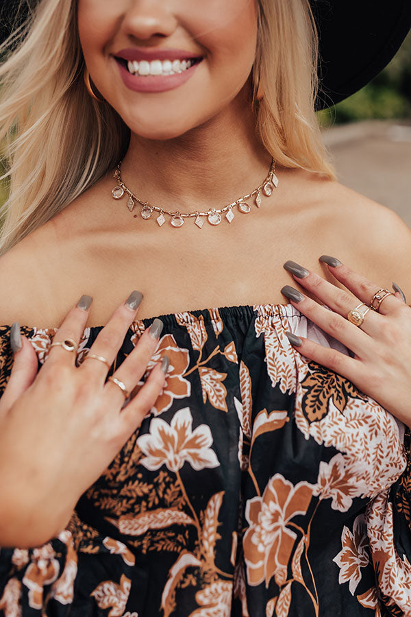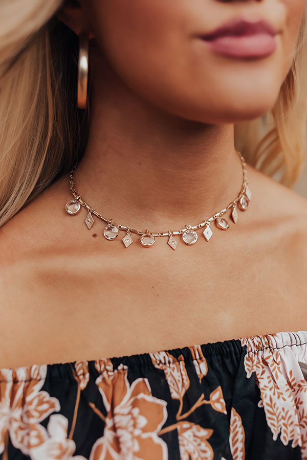 We have no doubt you fall happily in love with this dainty choker necklace featuring a dainty gold chain with clear gemstone and diamond shaped charms!