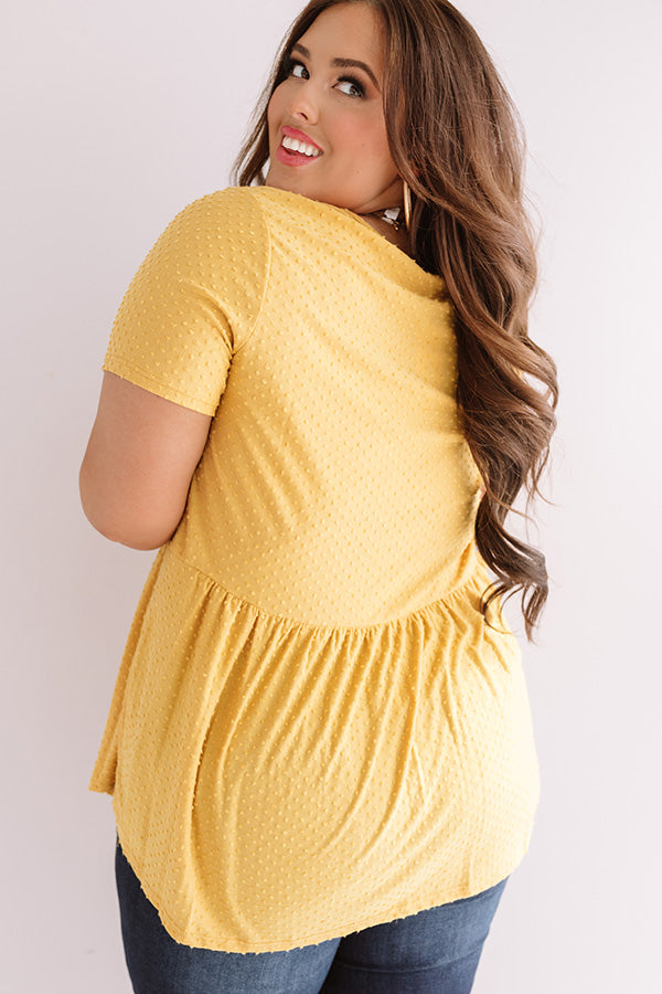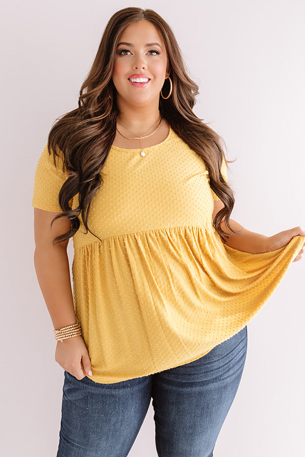 Plus Size - Create your own sunshine in our adorable yellow "Happiness Ahead" top featuring lightweight breezy material patterned with subtle polka dot texturing, a high rounded neckline, short sleeves, and a relaxed babydoll silhouette that falls into a rounded hemline! You can style this summer piece a variety of ways, like with some dark wash skinnies, neutral heels, and a woven crossbody, but you can also wear it with some white flares, "The Charlotte Espadrille in Yellow," and our "Brighton Beach Babe Hat!" Measurements