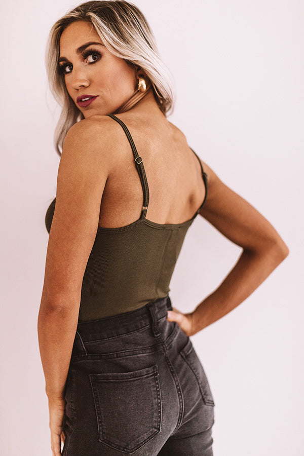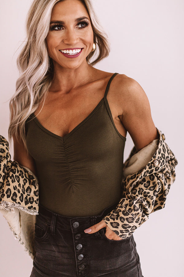 There is no better way to layer in style than with our olive colored "Happiness Beyond Measure" bodysuit featuring soft lightweight material, a deep v-cut neckline with bunched detailing on the bodice, spaghetti straps with an open back, and a fitted silhouette that falls into a cheeky fit with a two snap button closure! You can style this piece under any type of bottoms and wear any type of outerwear with it for a variety of looks that will carry you from season to season! Measurements