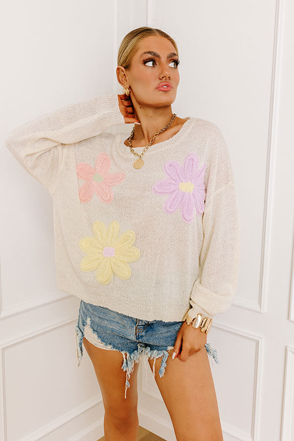 - Unlined loose knit material with a pink, yellow, purple, and green pastel hued floral design