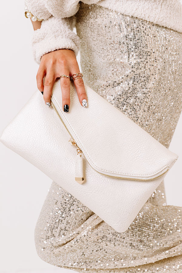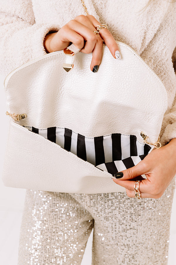 Life's a party, so accessorize like it with this glam crossbody featuring sleek pearl hued lightweight faux leather material, a removable gold chain link shoulder strap, and a spacious fully lined pouch with a zip flap closure!