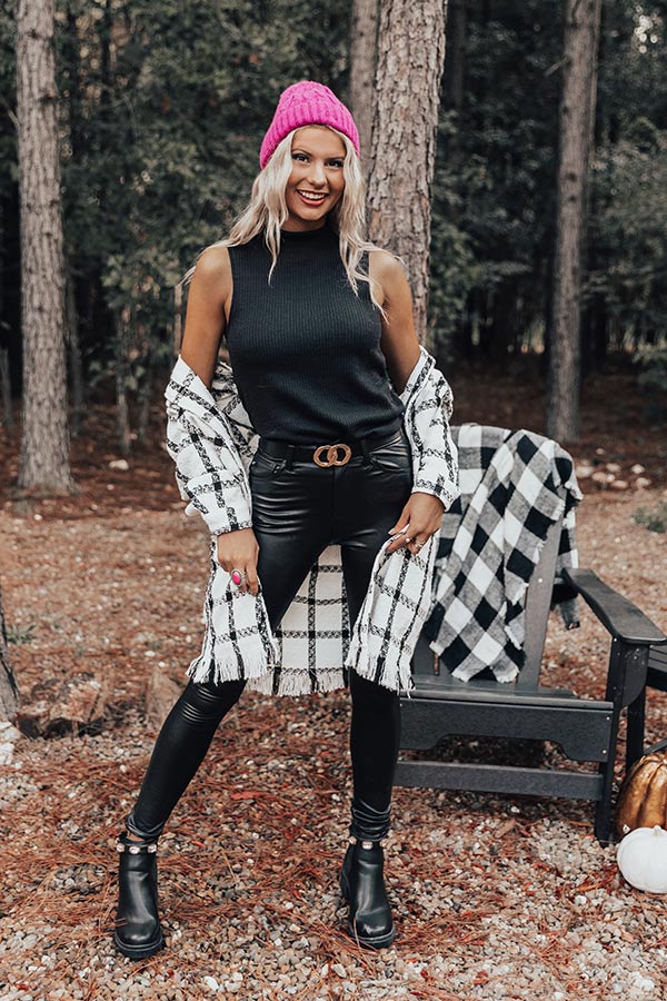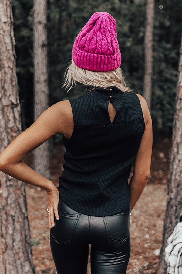 We have no doubt you will be happy to wear this photo-worthy black top featuring soft and stretchy knit material with ribbed texturing, a turtle neckline, wide sleeveless shoulder straps, a keyhole accented upper back with a two button closure, and a flattering silhouette that falls into a straight hemline! Measurements