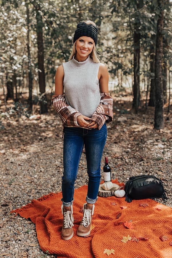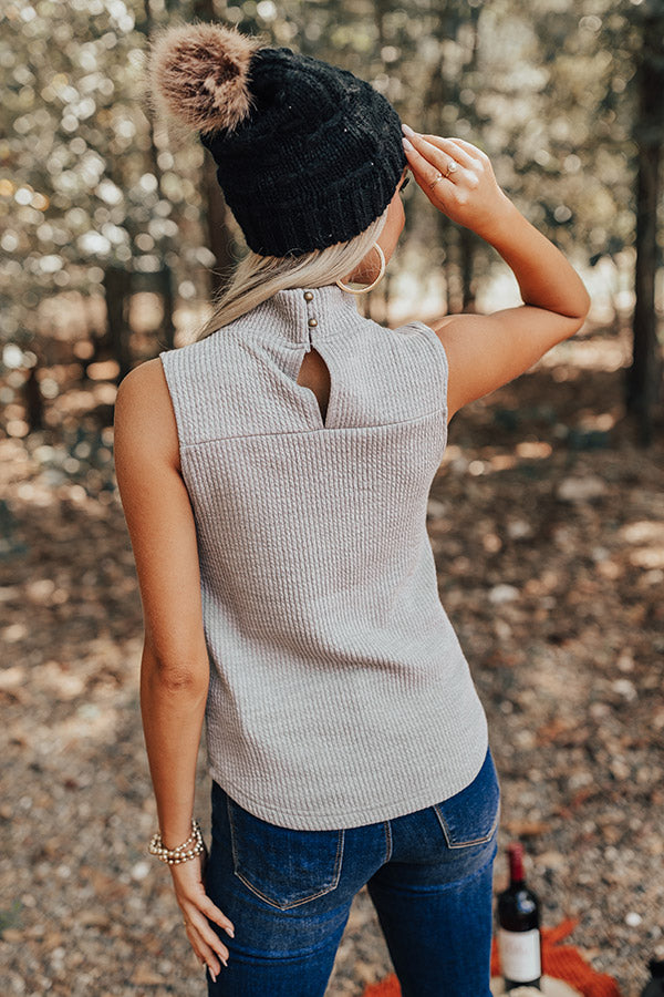 We have no doubt you will be happy to wear this photo-worthy grey top featuring soft and stretchy knit material with ribbed texturing, a turtle neckline, wide sleeveless shoulder straps, a keyhole accented upper back with a two button closure, and a flattering silhouette that falls into a straight hemline!
