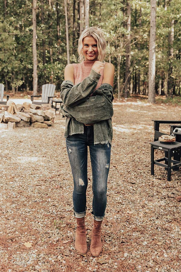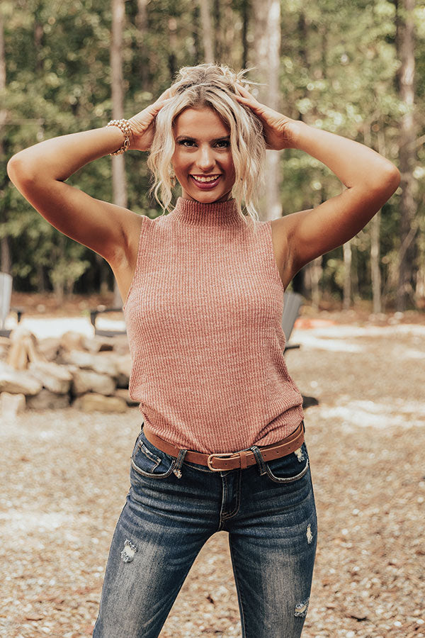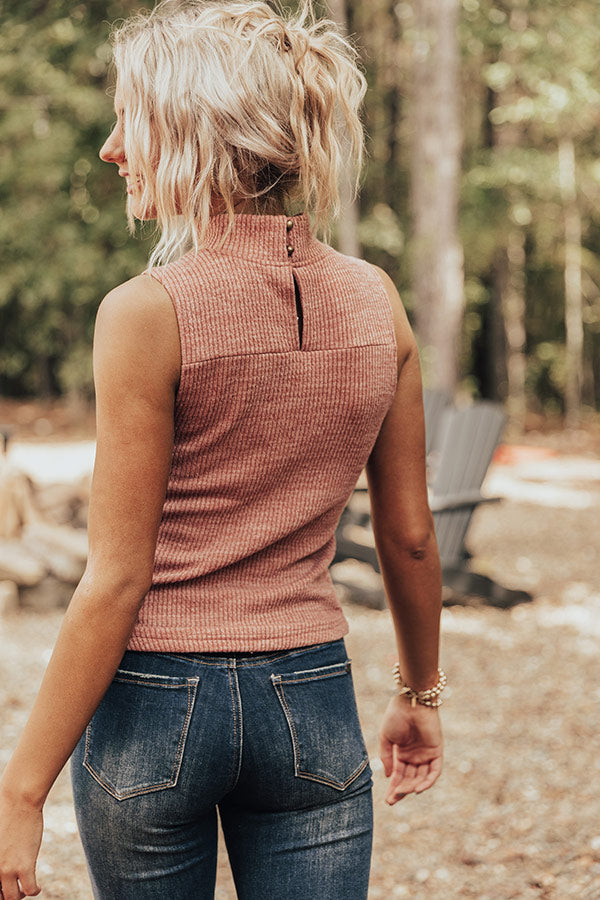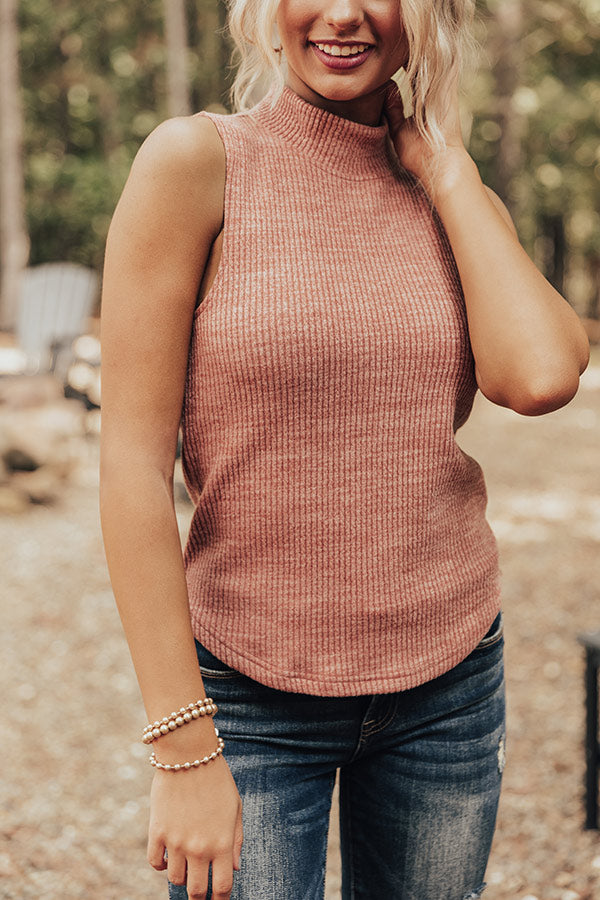 We have no doubt you will be happy to wear this photo-worthy rust colored top featuring soft and stretchy knit material with ribbed texturing, a turtle neckline, wide sleeveless shoulder straps, a keyhole accented upper back with a two button closure, and a flattering silhouette that falls into a straight hemline! Measurements