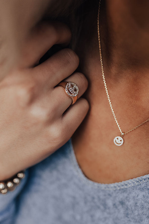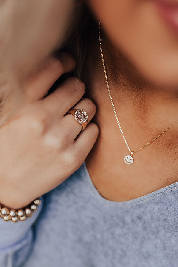 You will be in a happy state of mind when you accessorize with this trendy ring featuring a rhinestone smiley face set on a gold band! This ring can comfortably fit a size 7.
