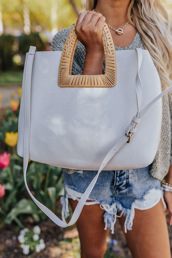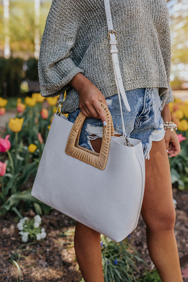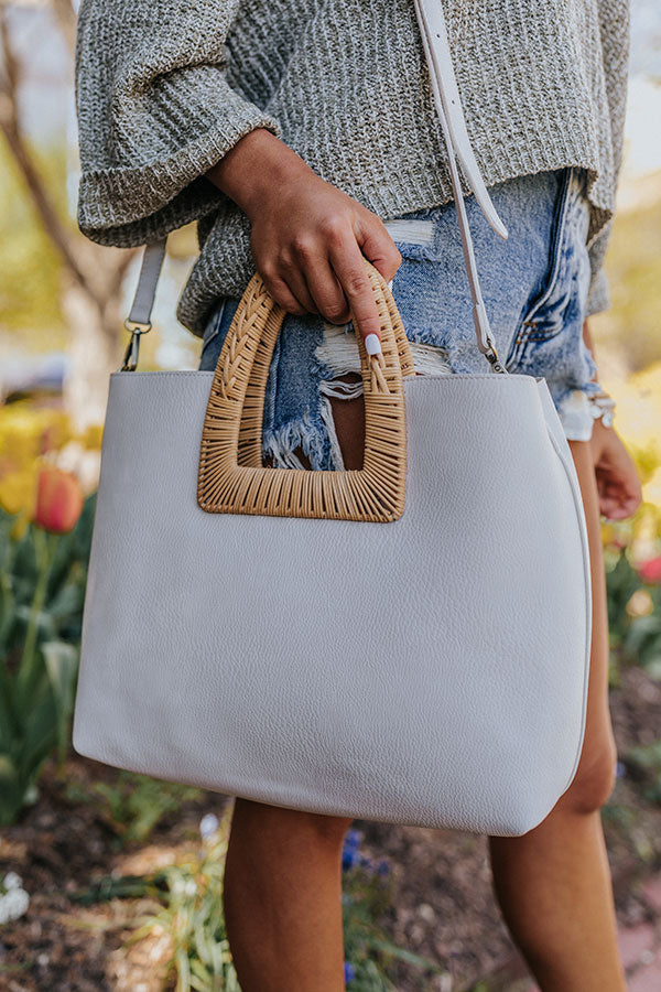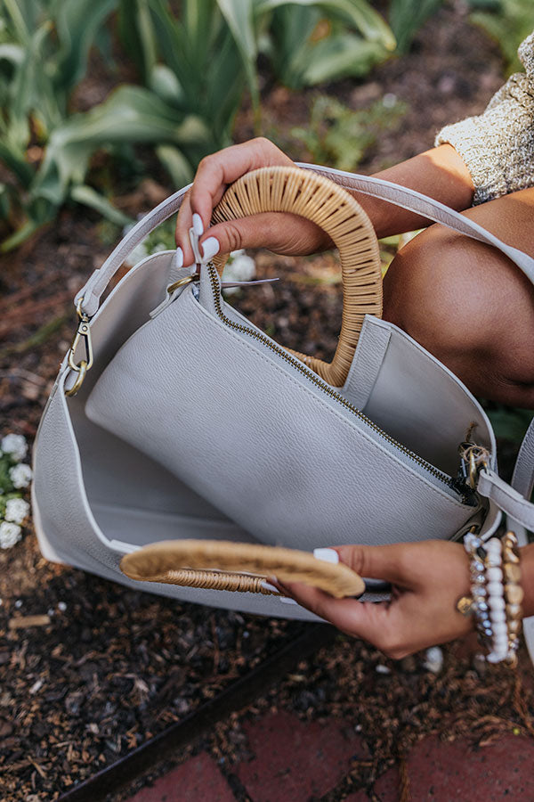 Welcome summer in style with our fashionable stone colored 'Harbor Lights' featuring faux leather material, two woven rounded tote handles, a removable and adjustable shoulder strap, and a spacious pouch with an additional separate zip closure bag inside!