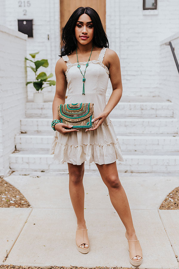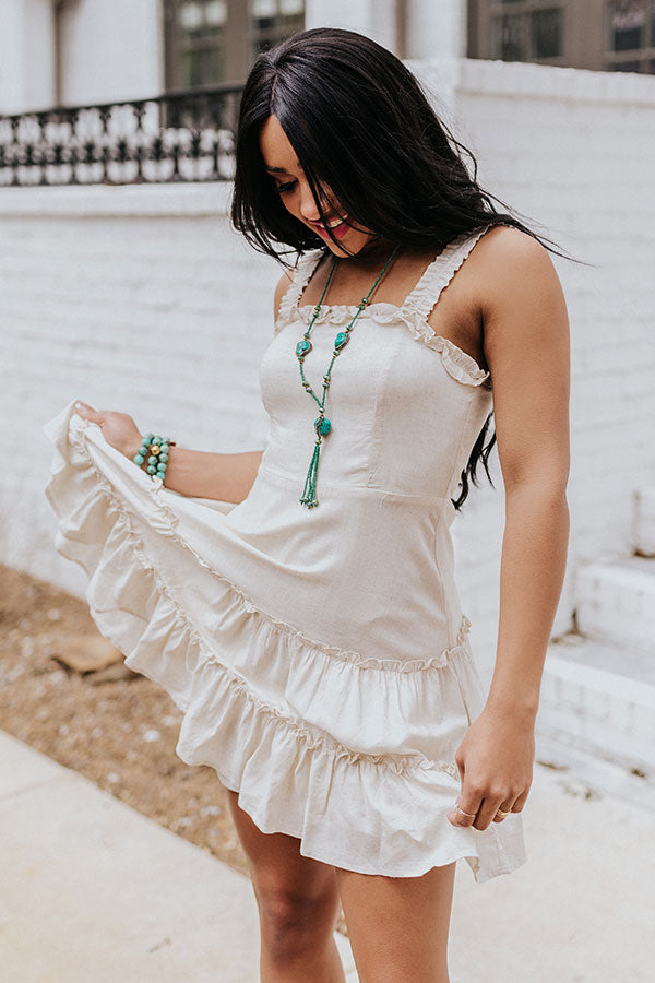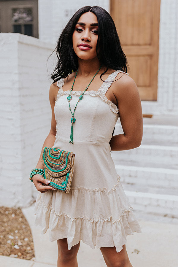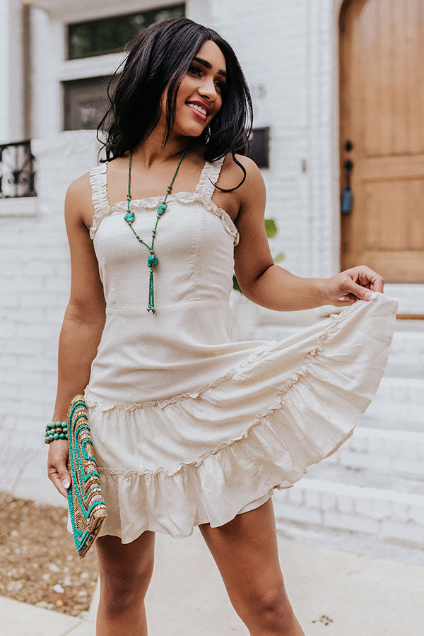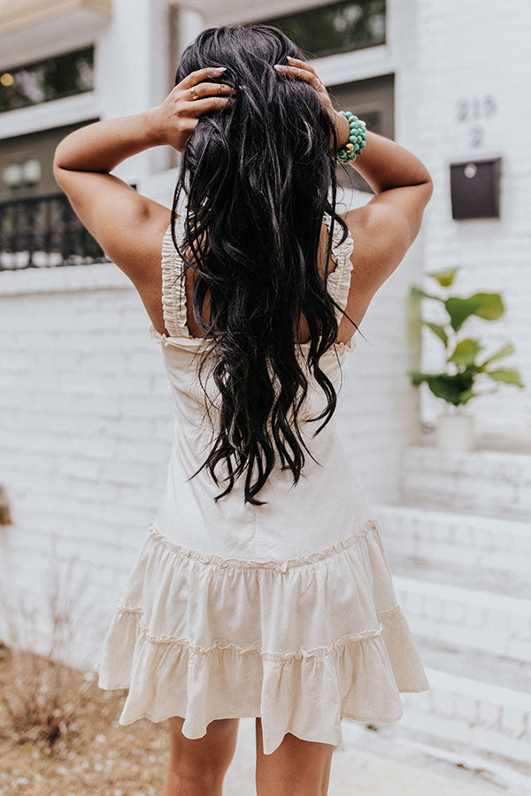 The perfect dress for every occasion just dropped! Our adorable stone colored 'Harbor Lights' dress featuring lightweight flowy material, a square neckline and upper back, ruffled sleeveless shoulder straps, a flattering form fitting bodice with smocked back detailing, and a flattering tiered skirt silhouette that falls into an uneven mid-thigh length hemline! Measurements
