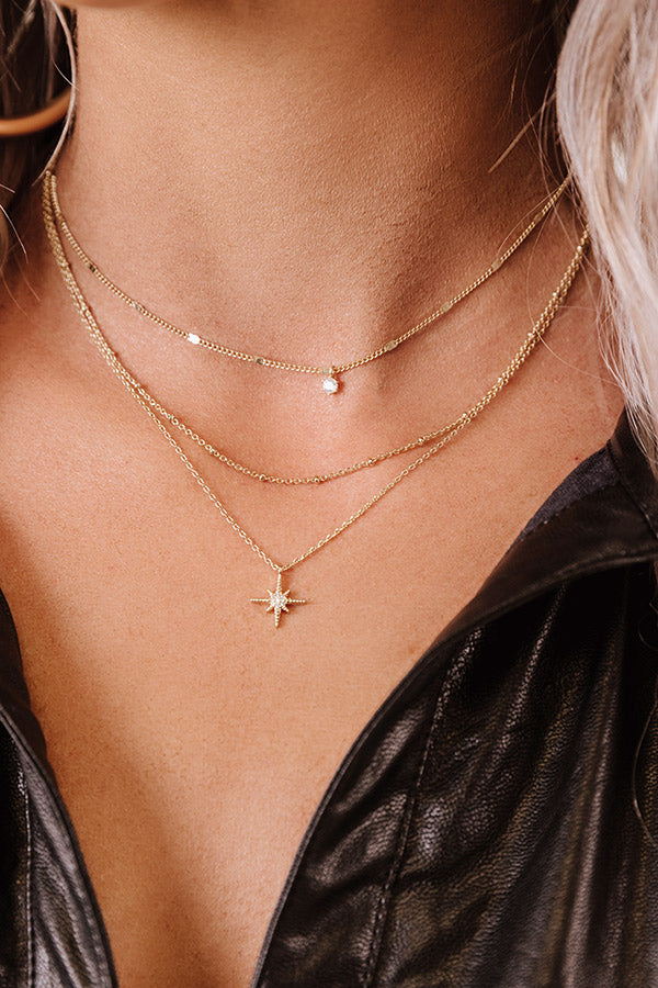 You and your amazing style will be hard to forget when you accessorize with this darling gold necklace featuring three layered chains with a tiny rhinestone and starburst charm!