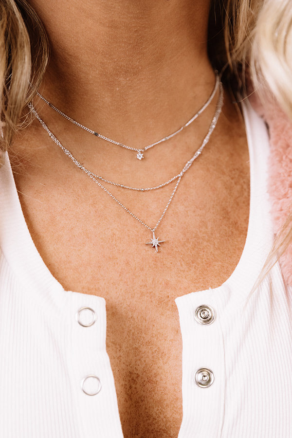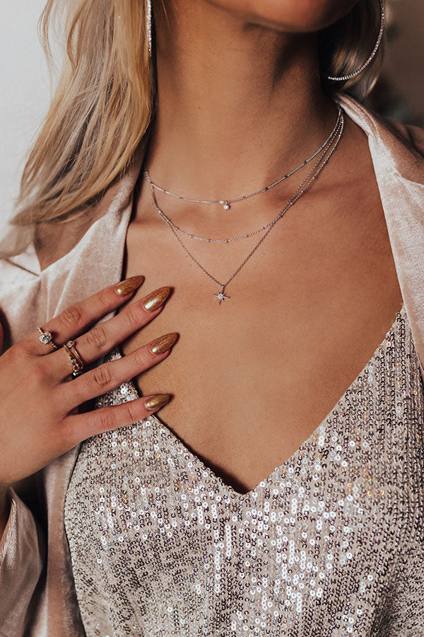 You and your amazing style will be hard to forget when you accessorize with this darling silver necklace featuring three layered chains with a tiny rhinestone and starburst charm!