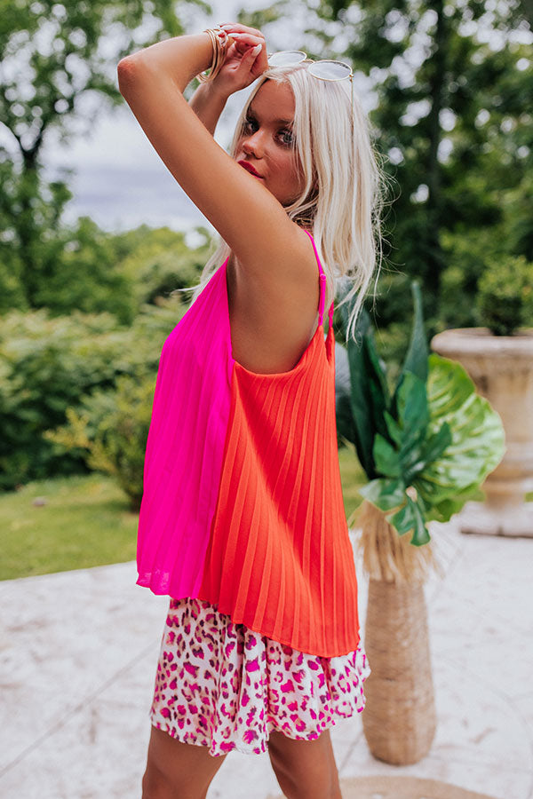 We don't blame you for adding this cute tank to your cart...it's hard to resist! It features lightweight flowy material with pleated texturing, a hot pink front and a red/orange back, a scooped neckline and upper back with adjustable spaghetti straps, and a relaxed silhouette that falls into an uneven hemline! Measurements