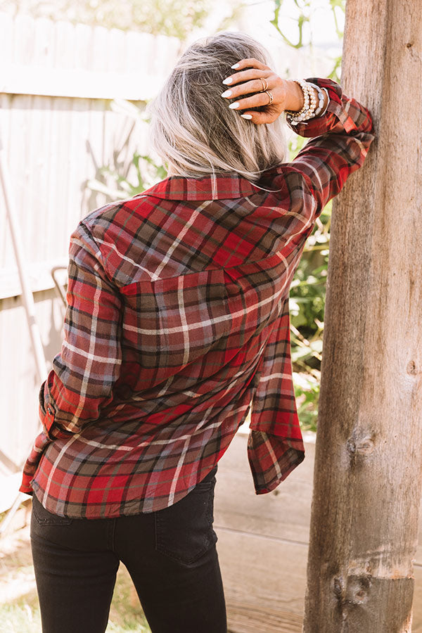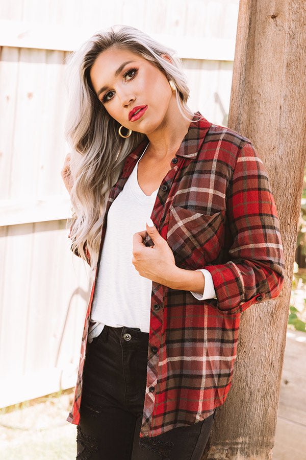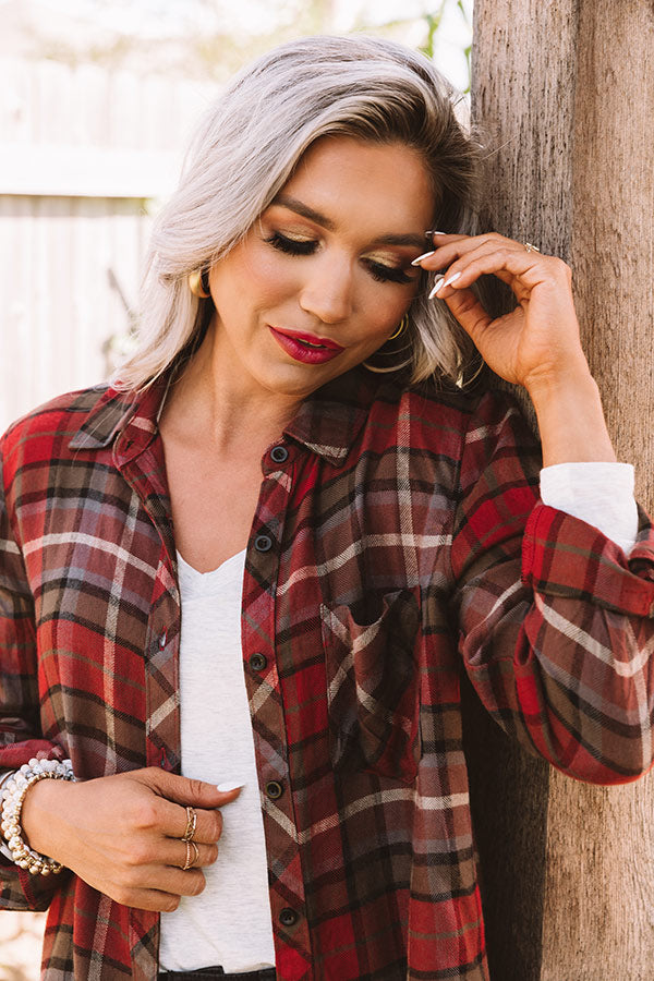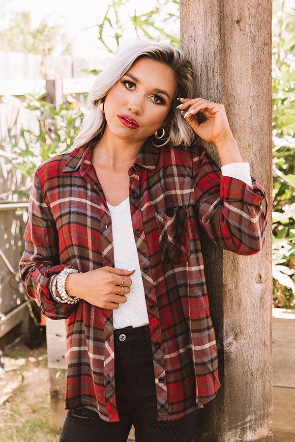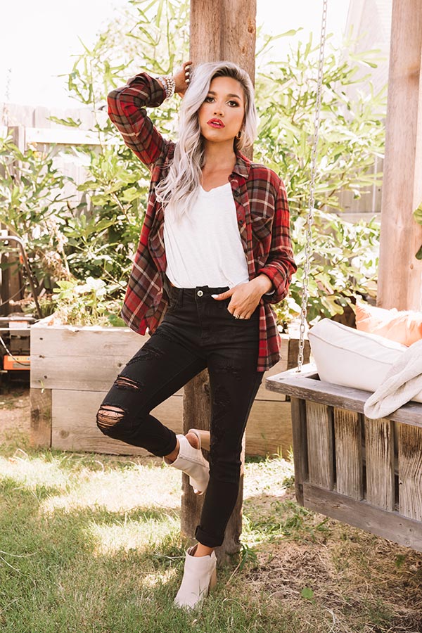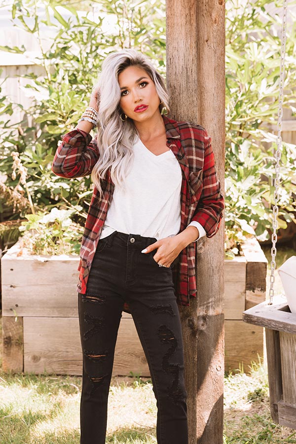 Nothing screams fall like a good plaid top, so don't hesitate to add our adorable red "Harvest Delight" top to your cart with its soft lightweight material patterned, black and white plaid pattern, button down front with a collared neckline, long loose sleeves with button closure cuffs, single accent chest pocket, and relaxed silhouette that falls into a rounded hemline! This versatile piece styles perfectly layered over a basic white tee with some distressed black skinnies and neutral peep toe booties, but you can also wear it solo with some frayed denim shorts, our white "Estelle Bootie," our matching "Fated Love Wool Hat," and our "Chic Harmony Fringe Tote in Black!" Measurements