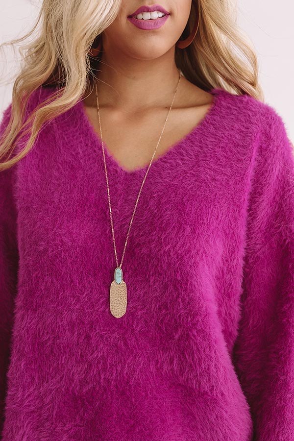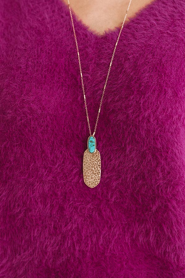 Be a glow-getter in the "Haute Destination" statement necklace featuring a long dainty chain with a faux stone and large textured gold pendant!