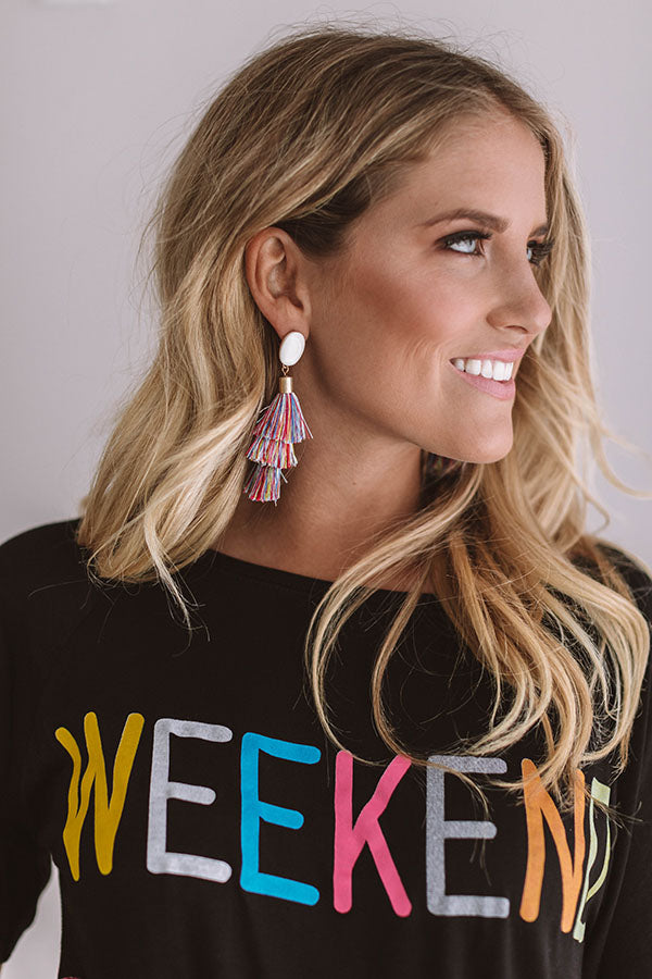 This just in..."haute off the press!" We've found the perfect multi colored earrings that can be worn all year round with their shiny ball stud and three tiered tassels!