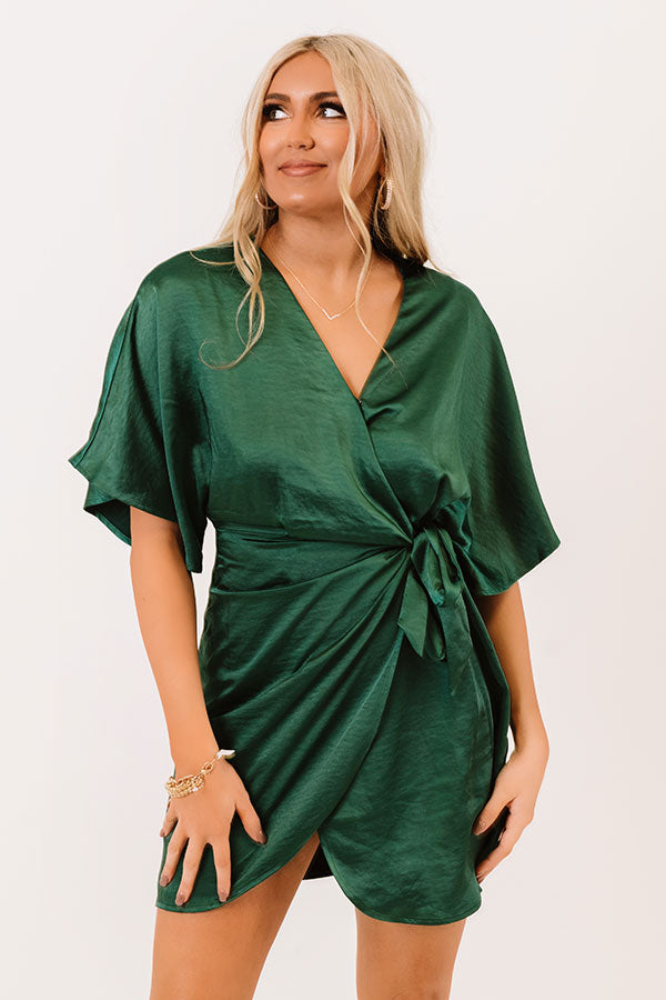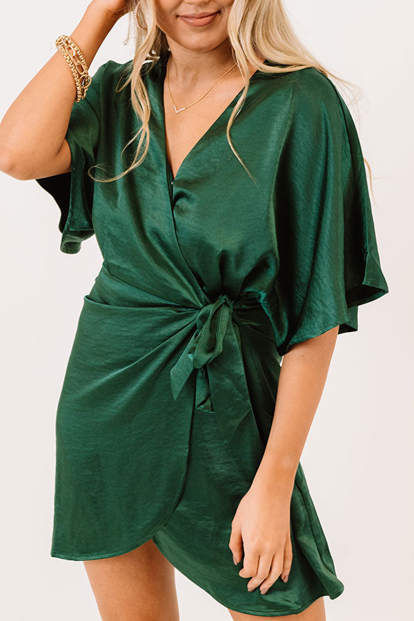You will undoubtedly be haute stuff when you wear this stunning emerald hued dress featuring sleek lightweight satin material, a wrapped bodice with a side tie closure, a v-cut neckline, loose half sleeves, and a flattering silhouette that ends in a mid-thigh length tulip hemline! Measurements