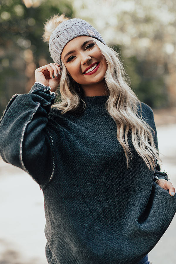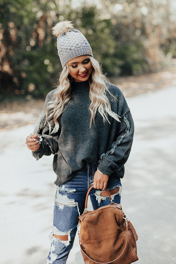 It's an add to cart kind of day, so treat yourself to our charming charcoal colored "Haute Tea" sweater featuring ultra soft lightweight chenille material, a high neckline, long loose sleeves with fitted cuffs that can be rolled and exposed accent seams, and an ultra slouched silhouette that falls into a straight ribbed hemline!