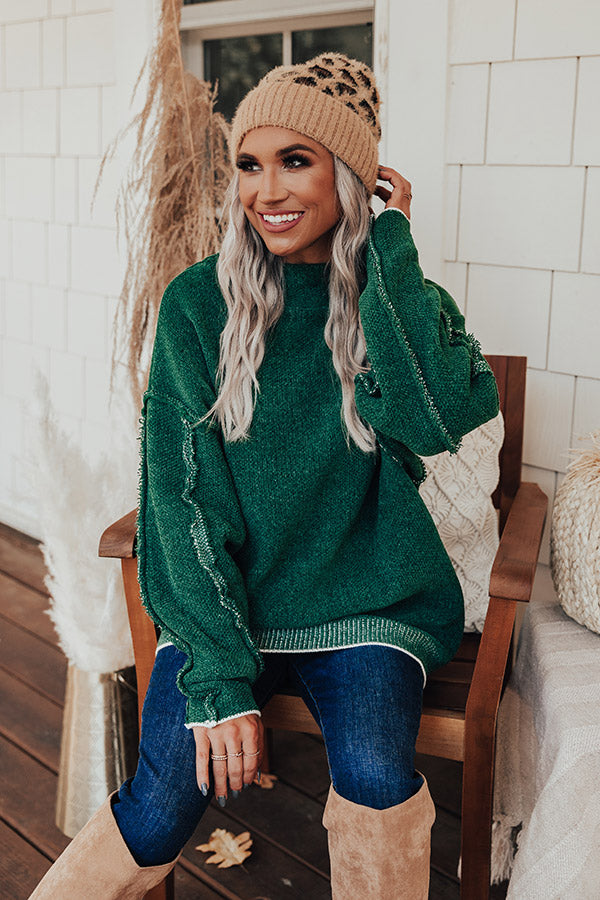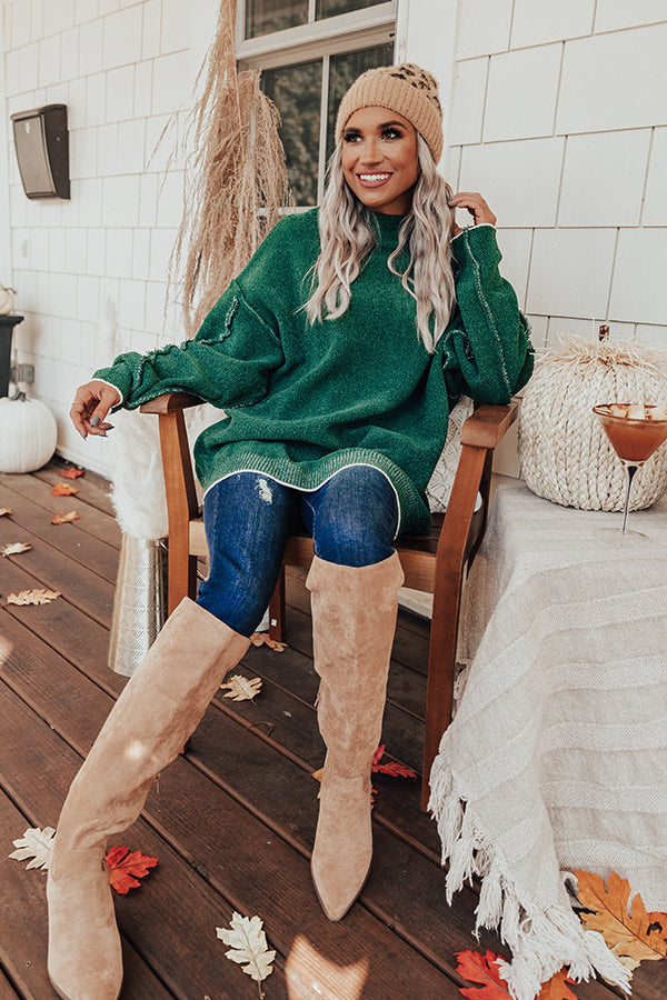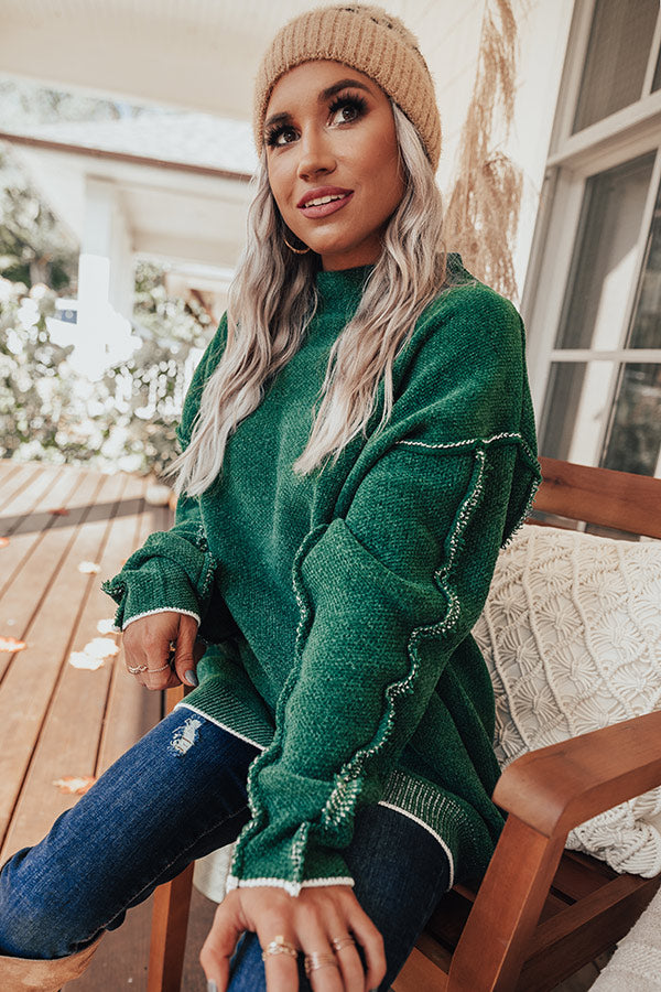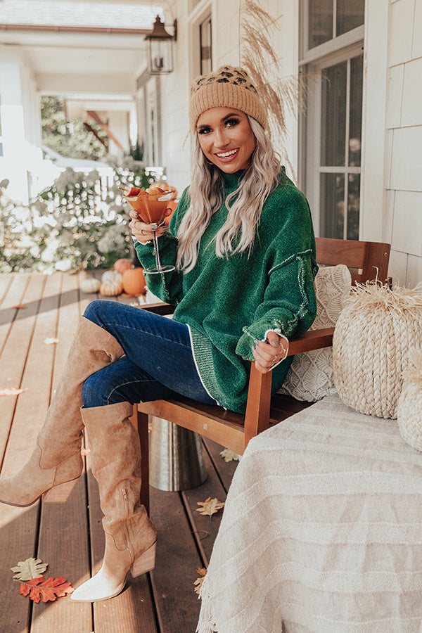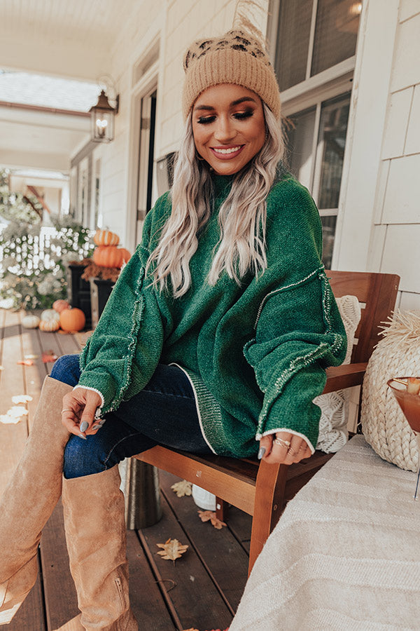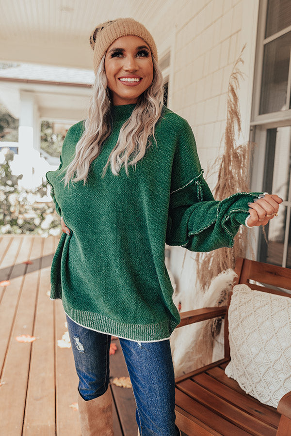 It's an add to cart kind of day, so treat yourself to our charming green "Haute Tea" sweater featuring ultra soft lightweight chenille material, a high neckline, long loose sleeves with fitted cuffs that can be rolled and exposed accent seams, and an ultra slouched silhouette that falls into a straight ribbed hemline! Measurements