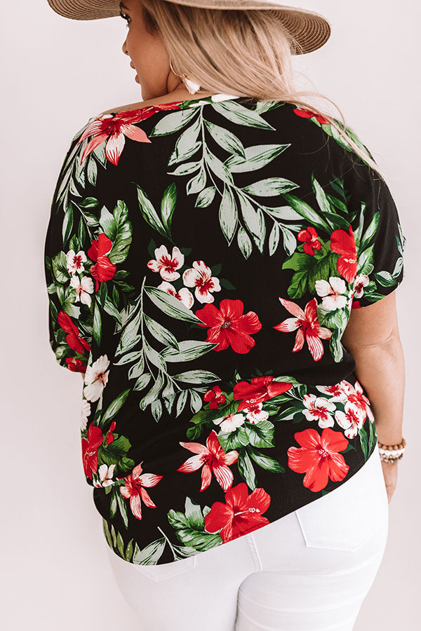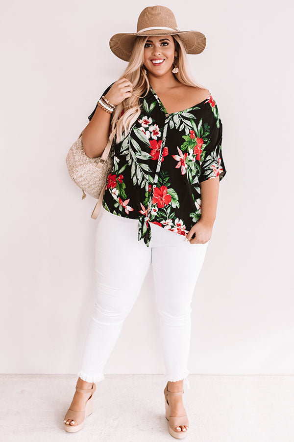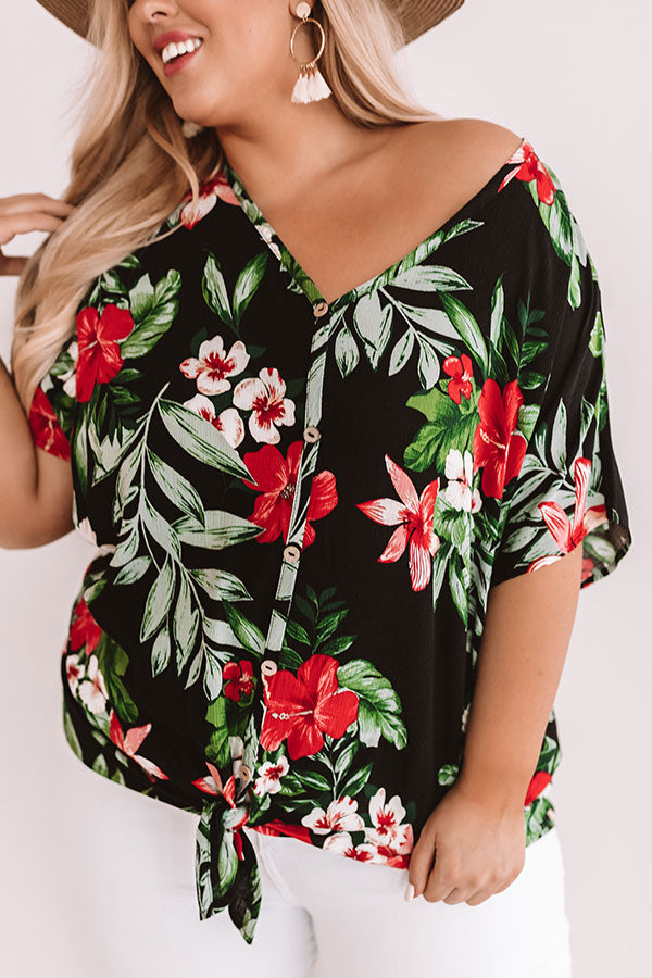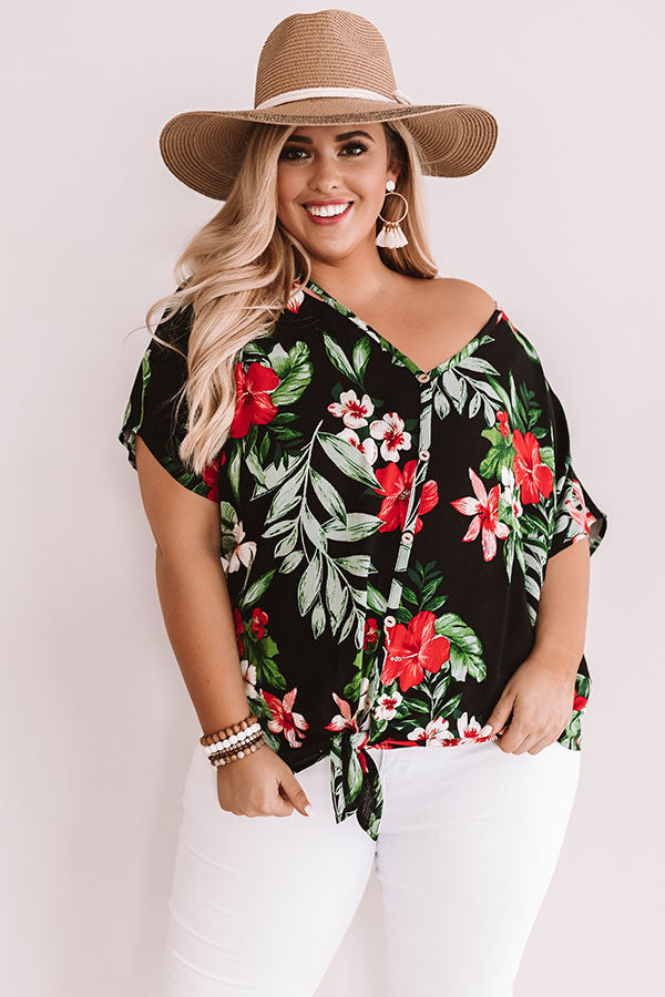 Plus Size - The "Hawaiian Holiday Shift Top" is giving us major vacay vibes! This floral printed tie top has a v-cut neckline, short sleeves, a faux button-down bodice, and a trendy tie front hem! Style with your favorite denim and a few colorful statement accessories like our green "Sea And Serenity Earrings" or a trendy tropical look that is perfect for your next vacay, BBQ or luau!