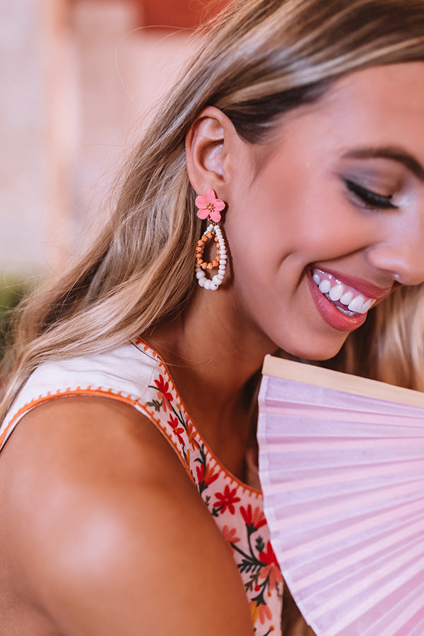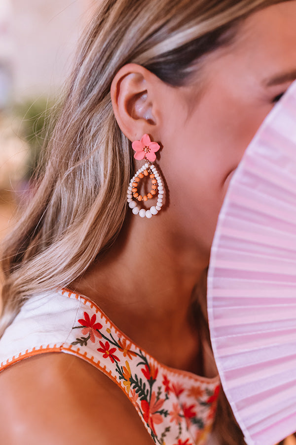 You will shine brighter than the "Hawaiian sunshine" when you accessorize with these adorable coral colored statement earrings featuring flower studs and two dangling beaded teardrops!