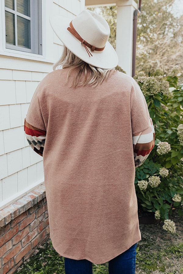 Plus Size - As the weather gets colder, heat up your style with our adorable light rust colored "Hayride Happiness Cardigan" featuring soft lightweight tight knit material, long oversized sleeves with fitted cuffs and horizontal fall hued accent stripes down the forearms, and an ultra draped open front silhouette that cascades into a straight mid-thigh length hemline! Measurements