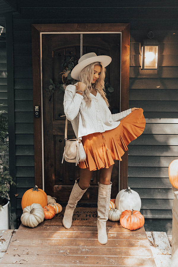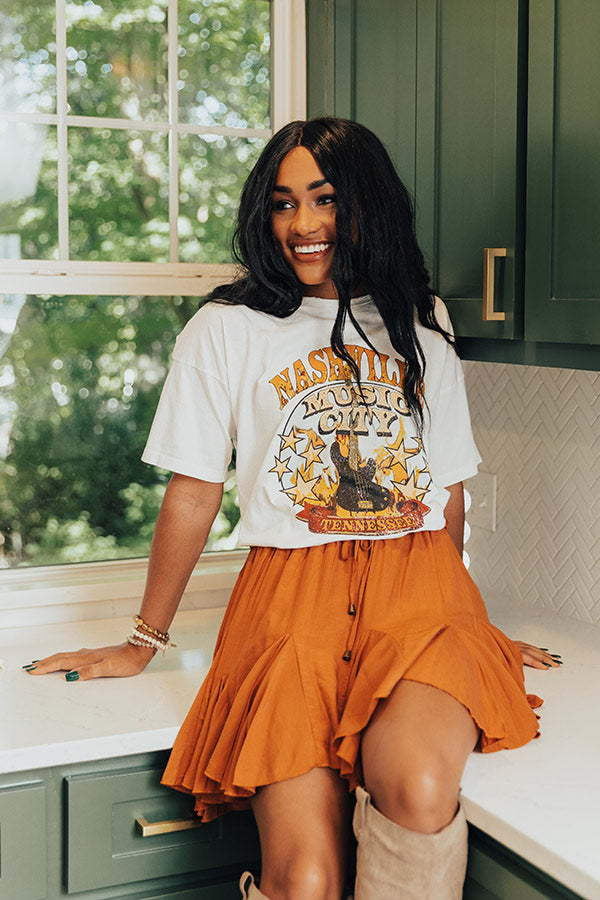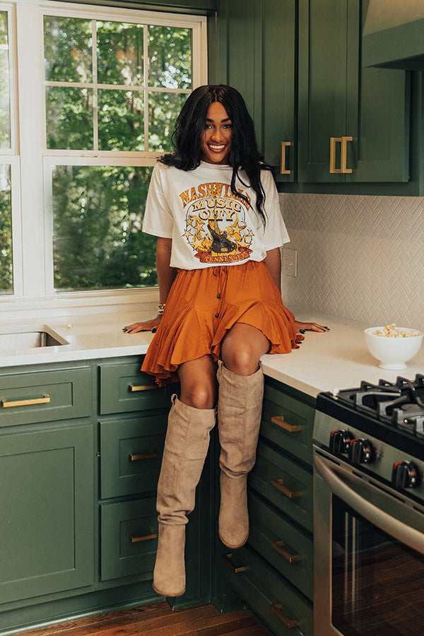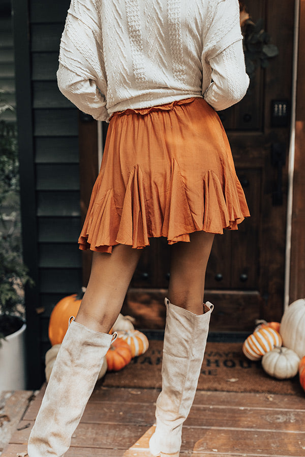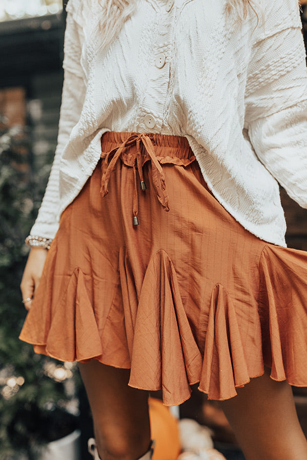 Stay looking fabulous while headed for happy hour with this adorable rust colored skort featuring lightweight shift material, a smocked elastic waistline with a tie belt closure and ruffle trim detailing, sewn in shorts, and an ultra relaxed silhouette that falls into a pleated and uneven mid-thigh length hemline! Measurements