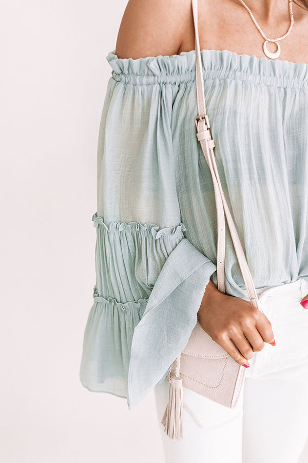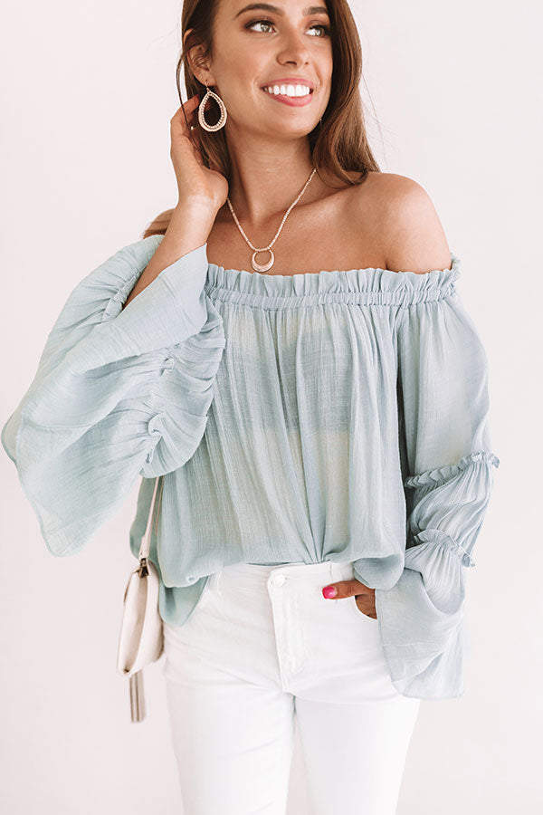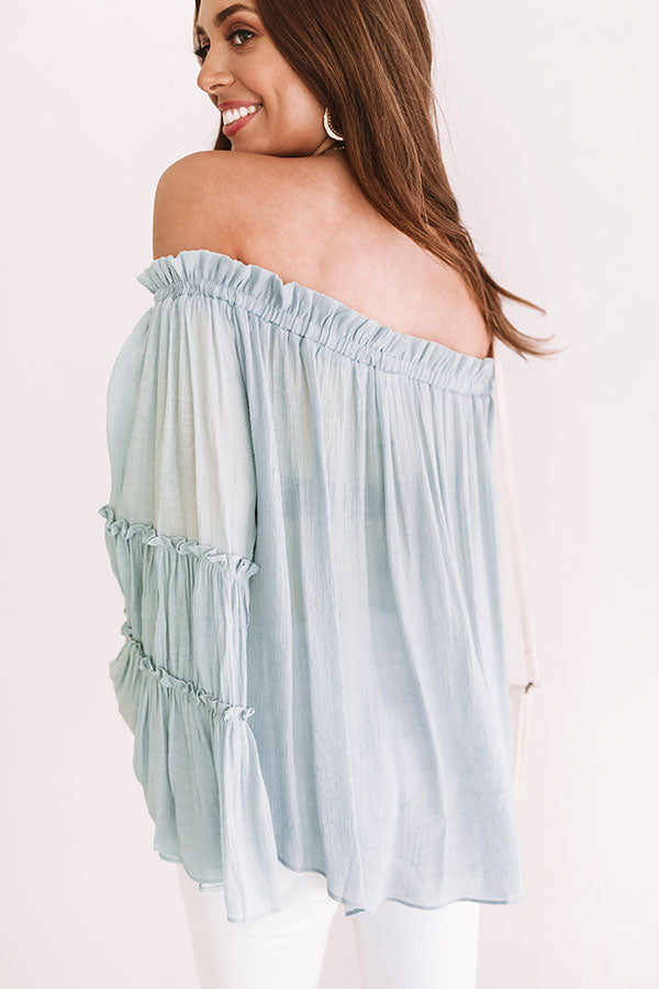 You'll look like you're "headed for hollywood" in this airy blue shift top with its ruffled off-shoulder fit, flared tiered sleeves, and a breezy semi sheer bodice that we recommend pairing with a bralette for more coverage! This dainty piece styles perfectly with our "Golden Shores High Waist Stripe Shorts in Vineyard Grape," a nude clutch, and "The Beck Espadrille Wedge in Light Natural" for a celebrity status look! Measurements