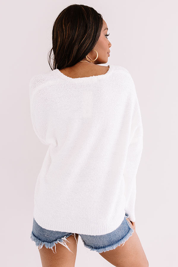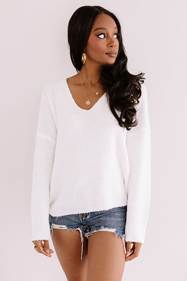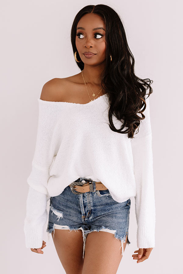 There is no better piece to wear when "headed to Aspen" than this darling white sweater featuring ultra soft and warm lightweight tight knit material, a wide v-cut neckline that can be worn off one shoulder, long loose bubble sleeves with fitted cuffs, ribbed trim detailing, and a relaxed silhouette that falls into a rounded hemline! Measurements
