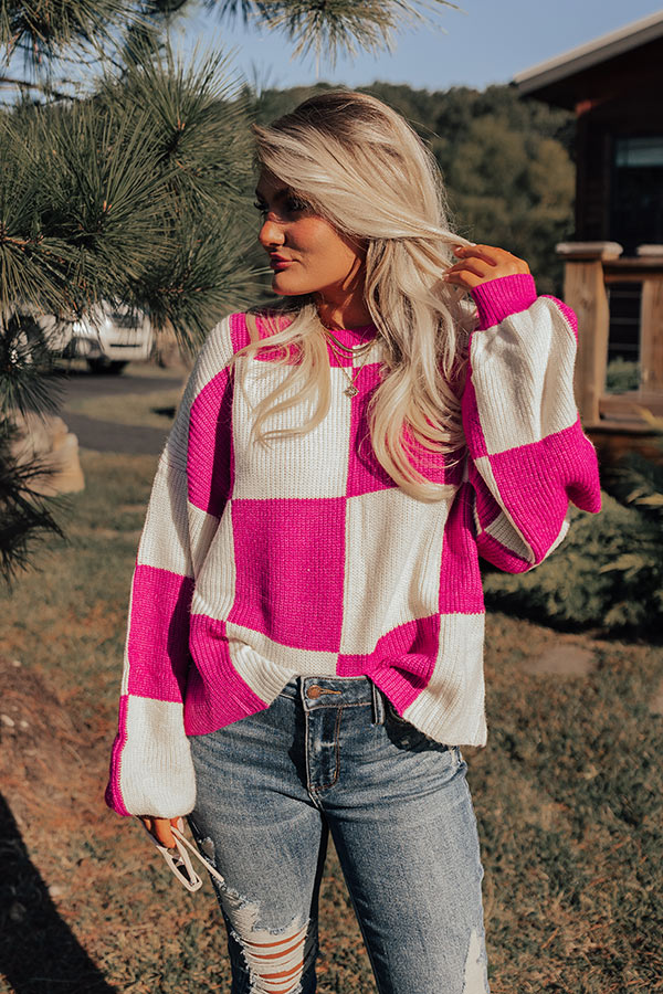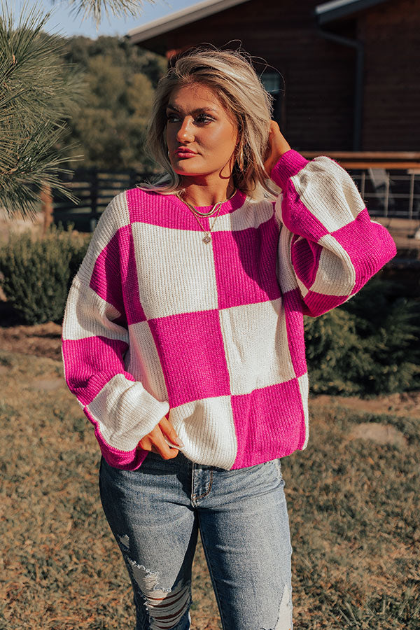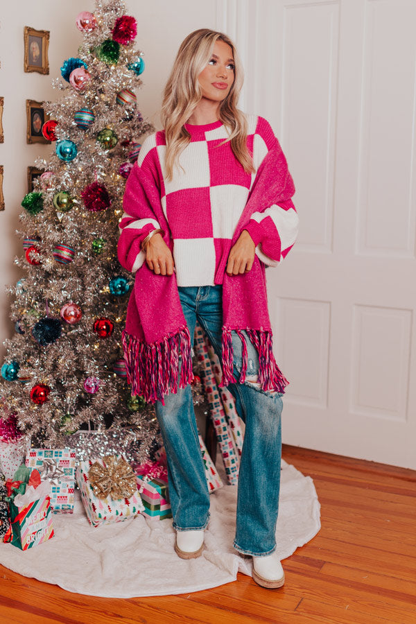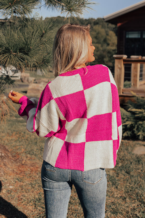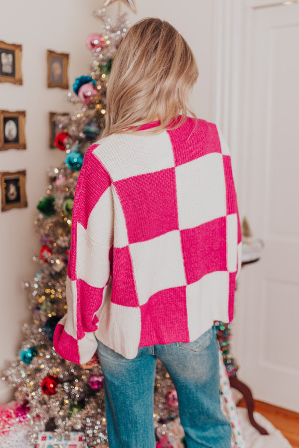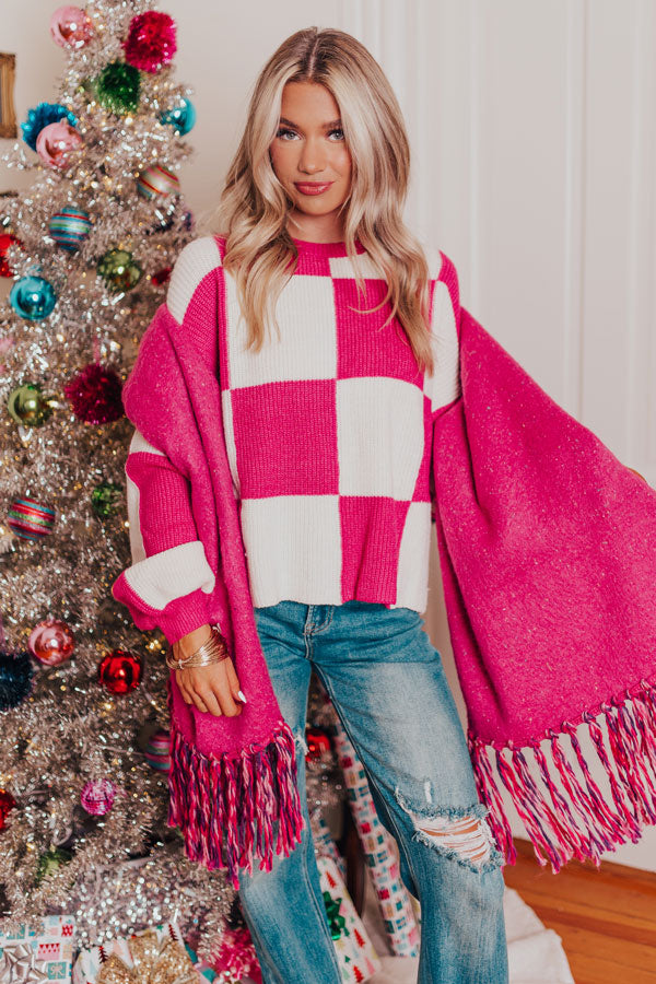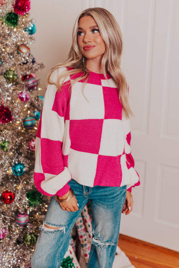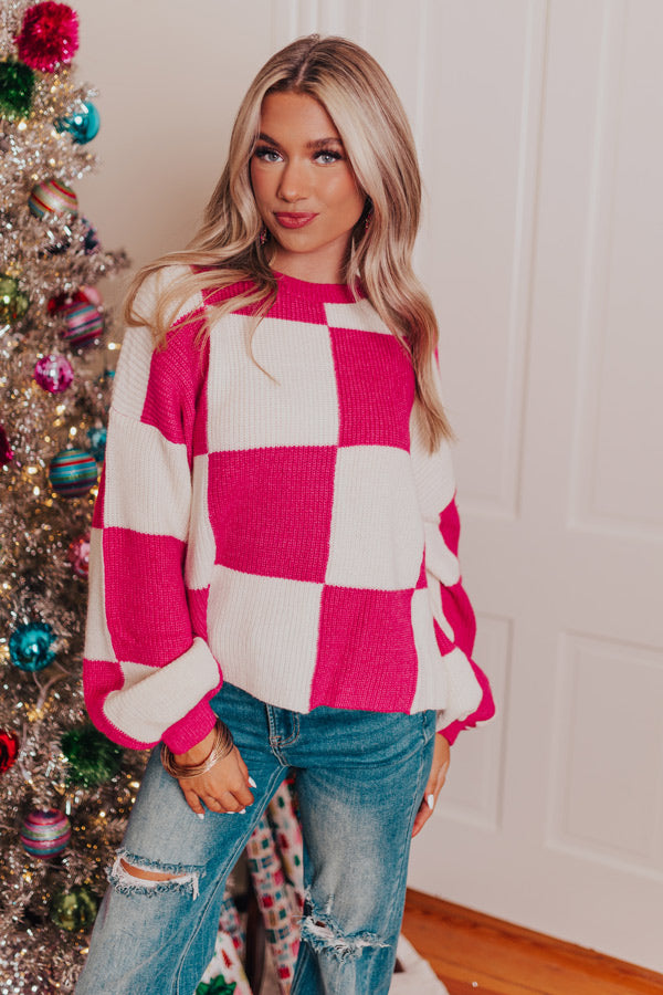 - Warm, fuchsia and ivory knit material with a checkered pattern
