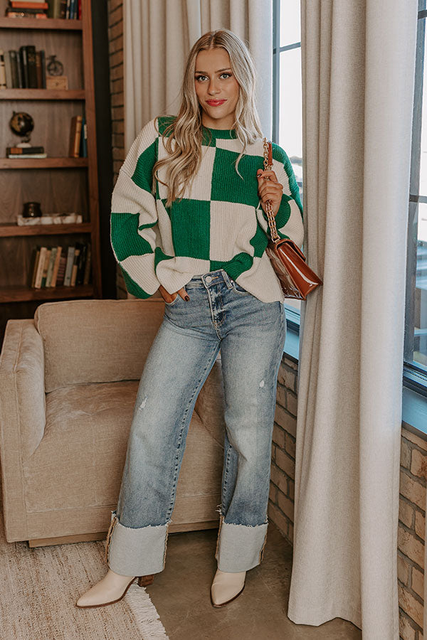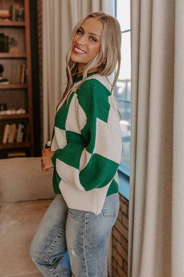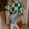 - Warm, hunter green and ivory knit material with a checkered pattern