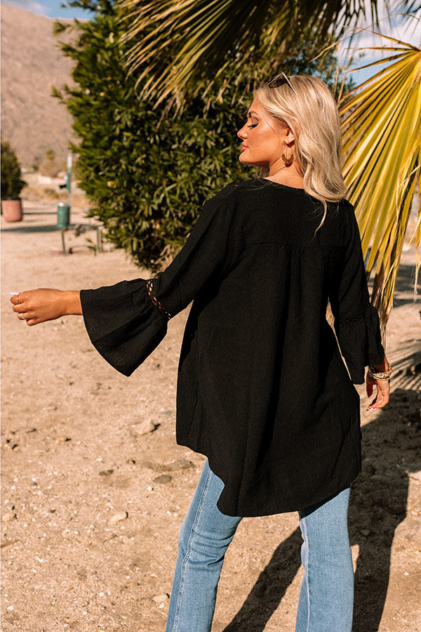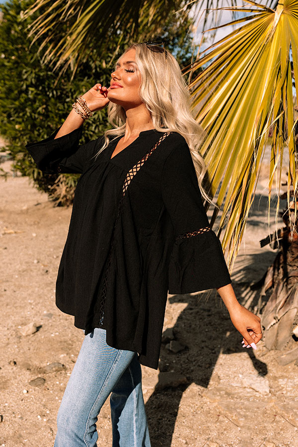 Arrive in style in our darling black 'Hear The Music Shift Top' featuring lightweight material with delicate crochet strips throughout, a v-cut neckline, loose 3/4-length bell sleeves, and a relaxed silhouette that falls into a straight hemline!