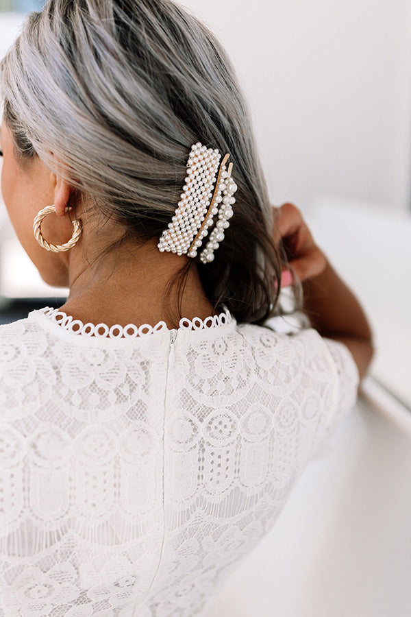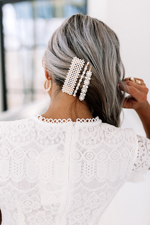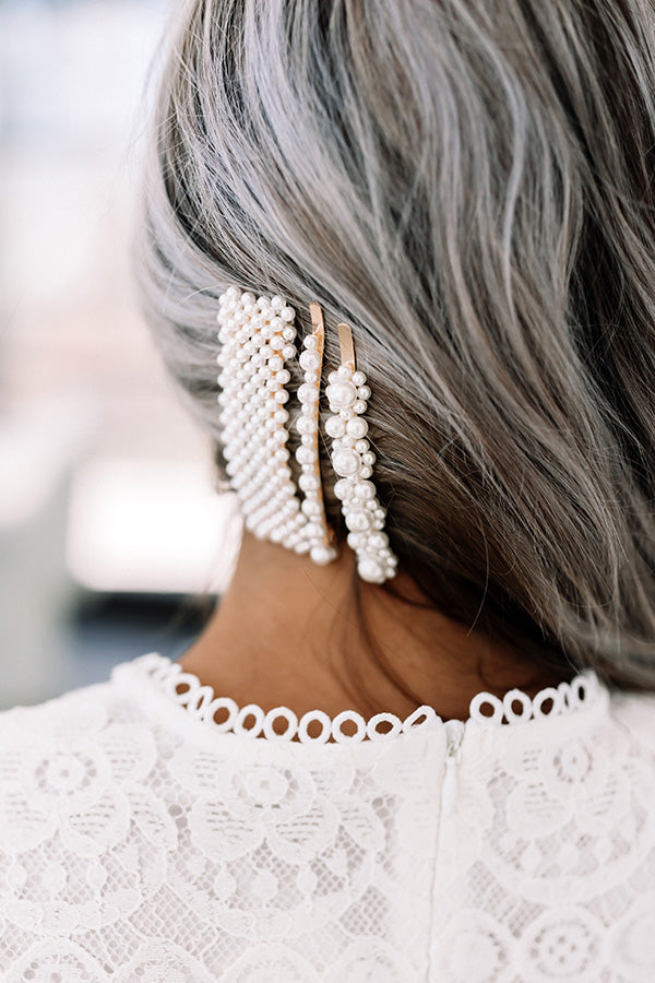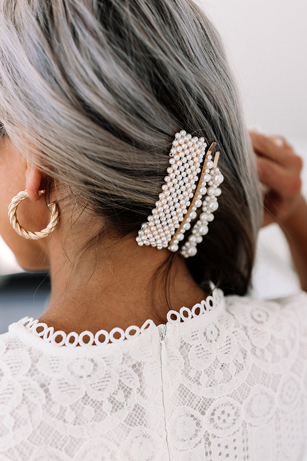 Add a darling finish to your little white dress look with our upscale 'Heart Flutters' hair clip set featuring three pieces: a rectangular pear clip, a skinny pearl bobby pin, and a larger pearl bobby pin!