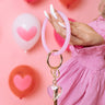 Add a little touch of love to your life with this adorable keychain featuring a light pink ring with a clear heart crystal charm and a horizontal gold bar!
