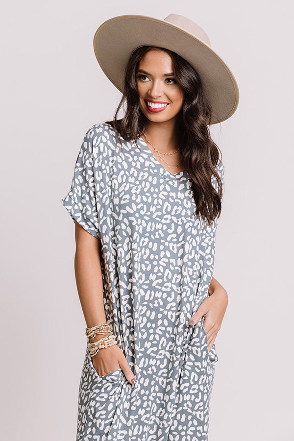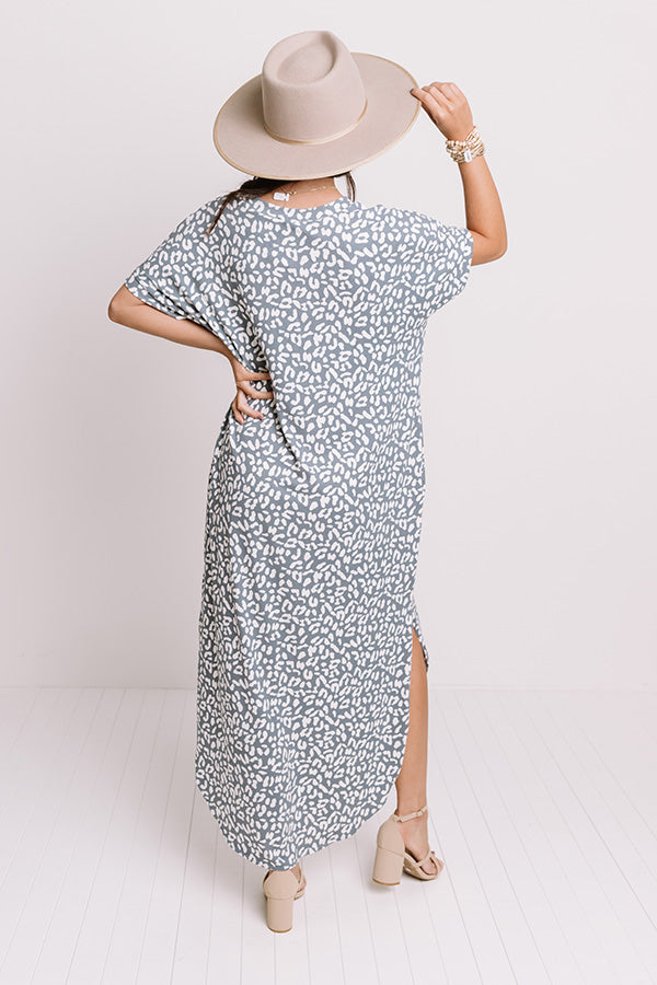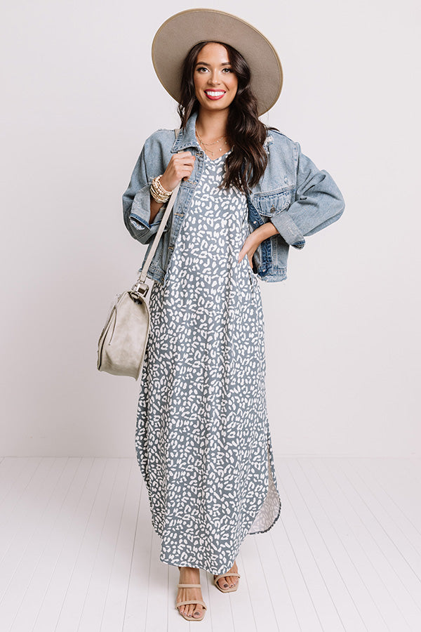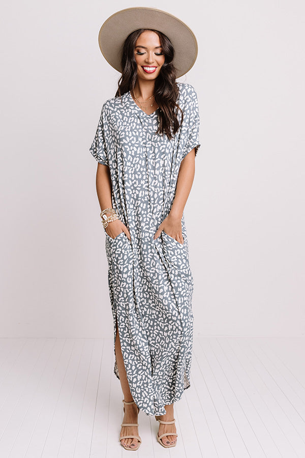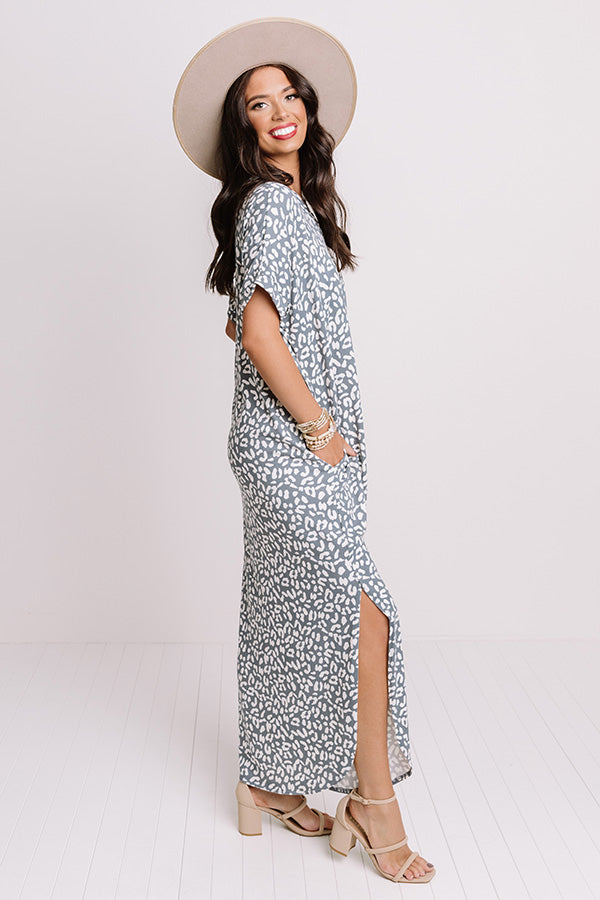 Dress for the warm summer weather with our adorable slate colored "Heart Of The City" maxi dress featuring soft lightweight material patterned with a faded leopard print, a v-cut neckline, short loose sleeves with wide cuffs, accent side pockets, and an ultra relaxed silhouette that falls into a rounded floor length hemline with thigh high side slits! Measurements