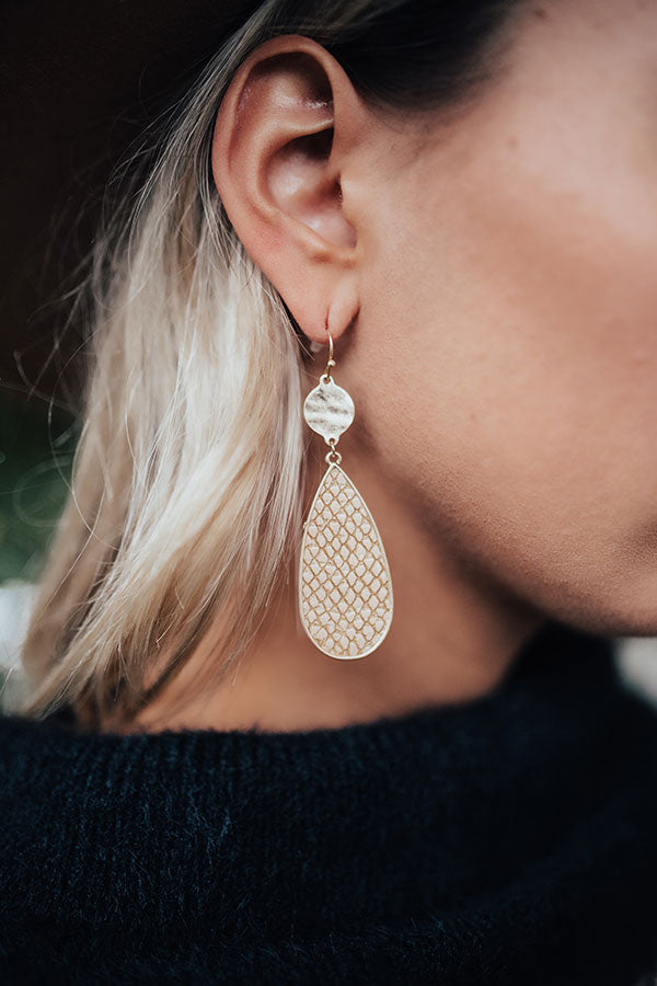 Wow the crowd when you accessorize with our "Heartland Happiness" statement earrings featuring dangling textured gold circles and tan teardrop pendants!