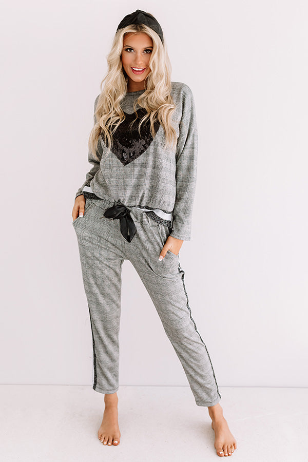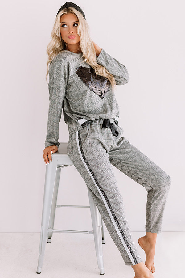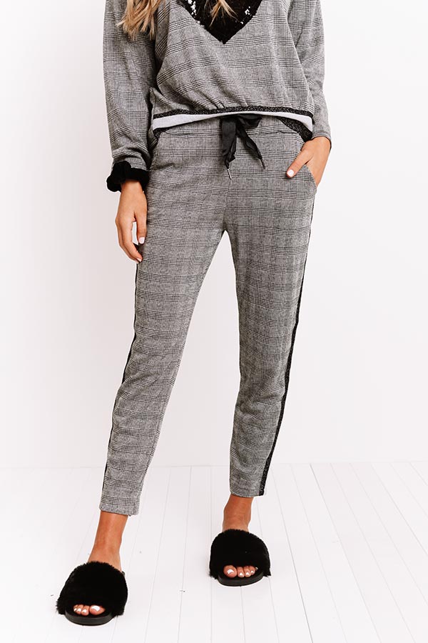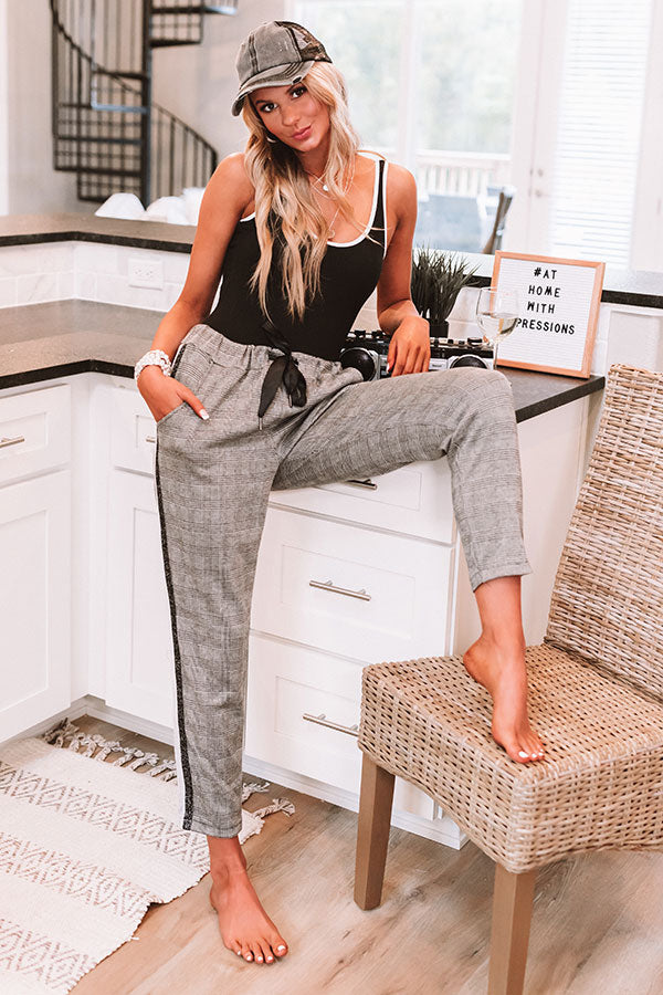 Your heart is sure to be filled with happiness when you wear these adorable grey pants featuring soft lightweight material patterned with a subtle black plaid print, black and white accent stripes down the side, an elastic waistband with a tie belt closure, hidden side pockets and two back pockets, and a relaxed silhouette that falls into fitted ankle hemlines! Measurements