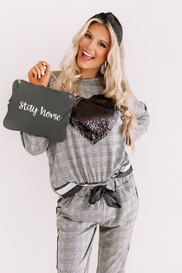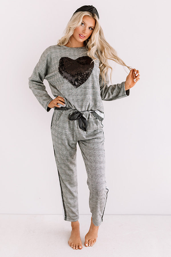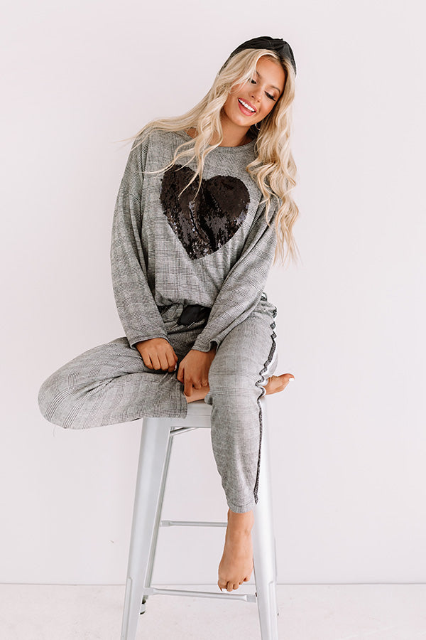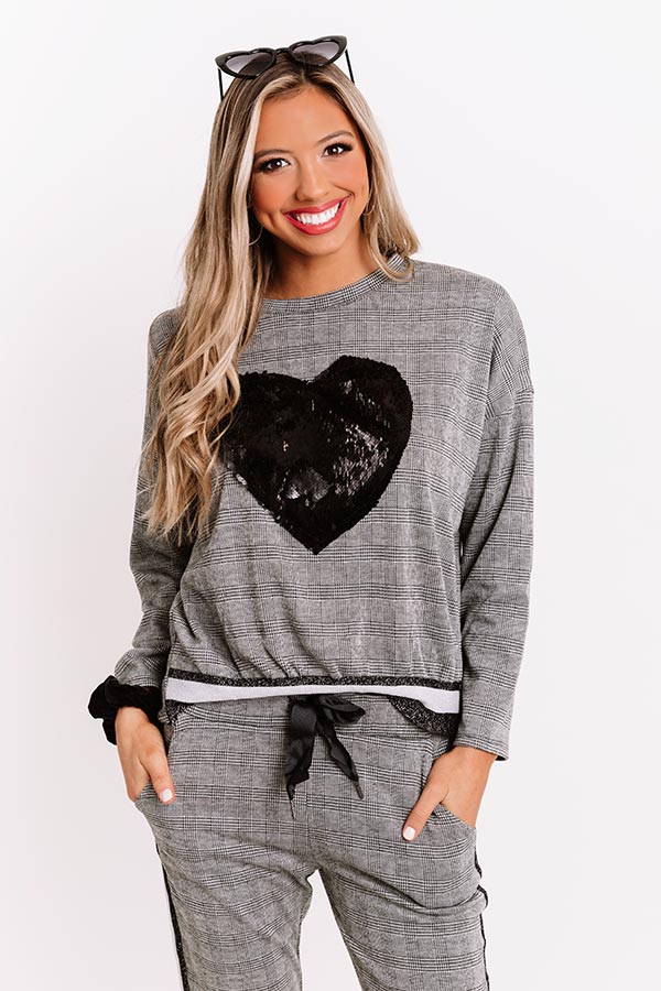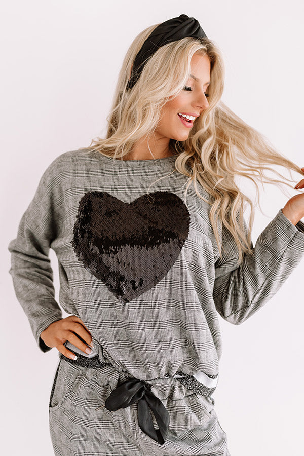 Your heart is sure to be filled with happiness when you wear this adorable grey sweatshirt featuring soft lightweight material patterned with a subtle black plaid print, long loose sleeves, a black sequin heart on the front, and a relaxed silhouette that falls into a straight hemline!