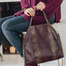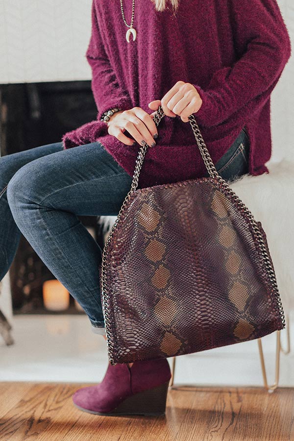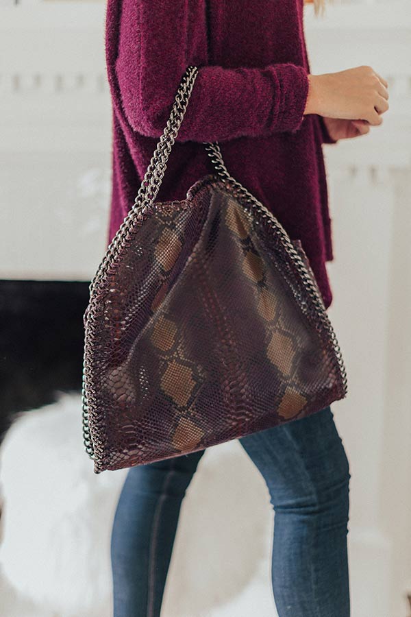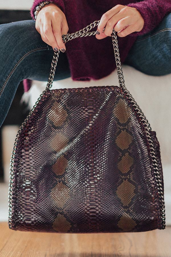 Your heart will run wild when you treat yourself to this sleek purple tote featuring an edgy snake print pattern and texture, a spacious fully lined pouch, and chain link handles and trim!