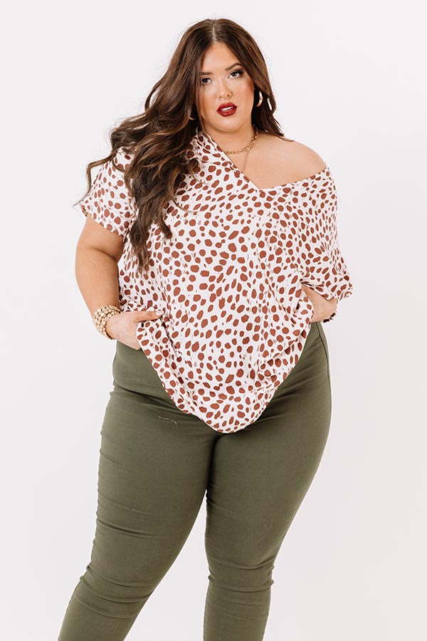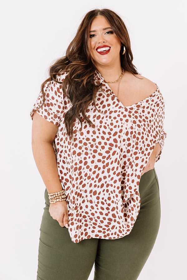 Plus Size - You will surely want to to be "spotted" in our darling camel colored "Hello Sugar Shift Top" featuring lightweight flowy material patterned with a bold spotted print, a high v-cut neckline, short loose sleeves, and a relaxed silhouette that falls into a rounded hemline!