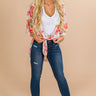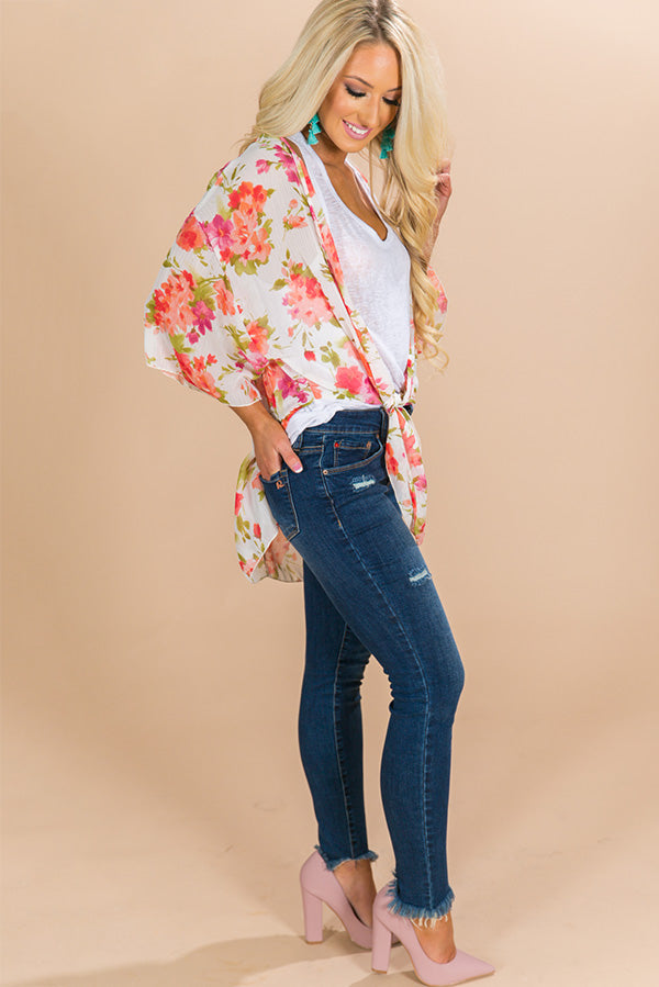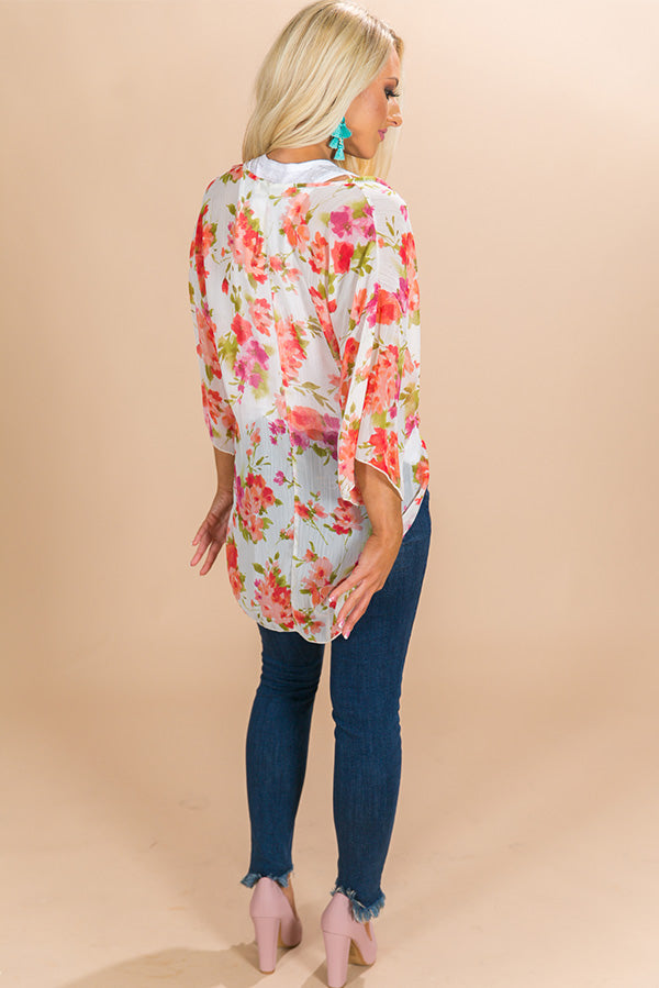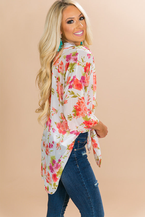 Hello sunshine... hello gorgeous! This breezy floral printed chiffon overlay has short sleeves, a relaxed silhouette & split sides that can be tied in the front to add a sassy spin to your look.