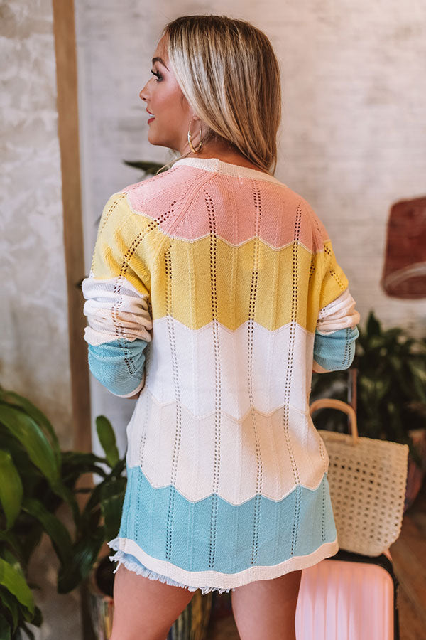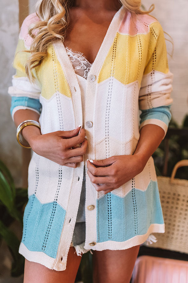 Layer up for summer in style with our adorable 'Helping Hand' cardigan featuring soft lightweight tight knit material with subtle crochet detailing, wide horizontal pastel accent stripes with jagged seams, long loose sleeves with fitted cuffs, and an ultra relaxed button up front silhouette that falls into a straight hemline! Measurements
